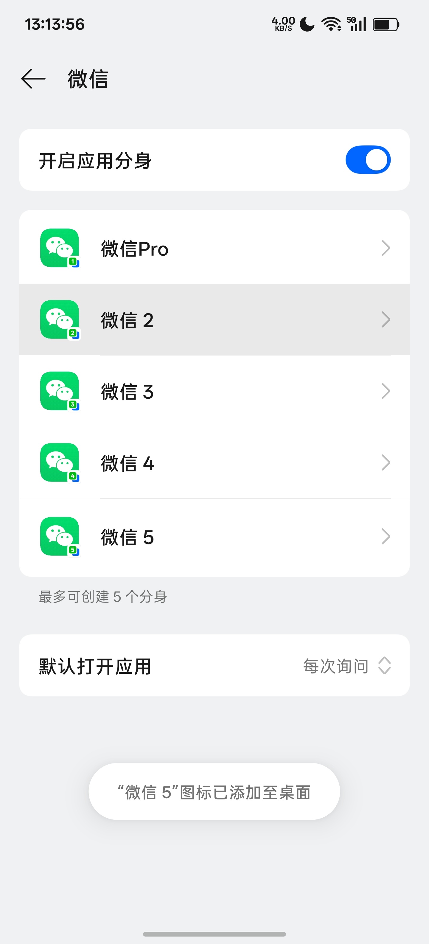 系统一个,多开可以开5个微信,配合系统分身,还可以开6个。