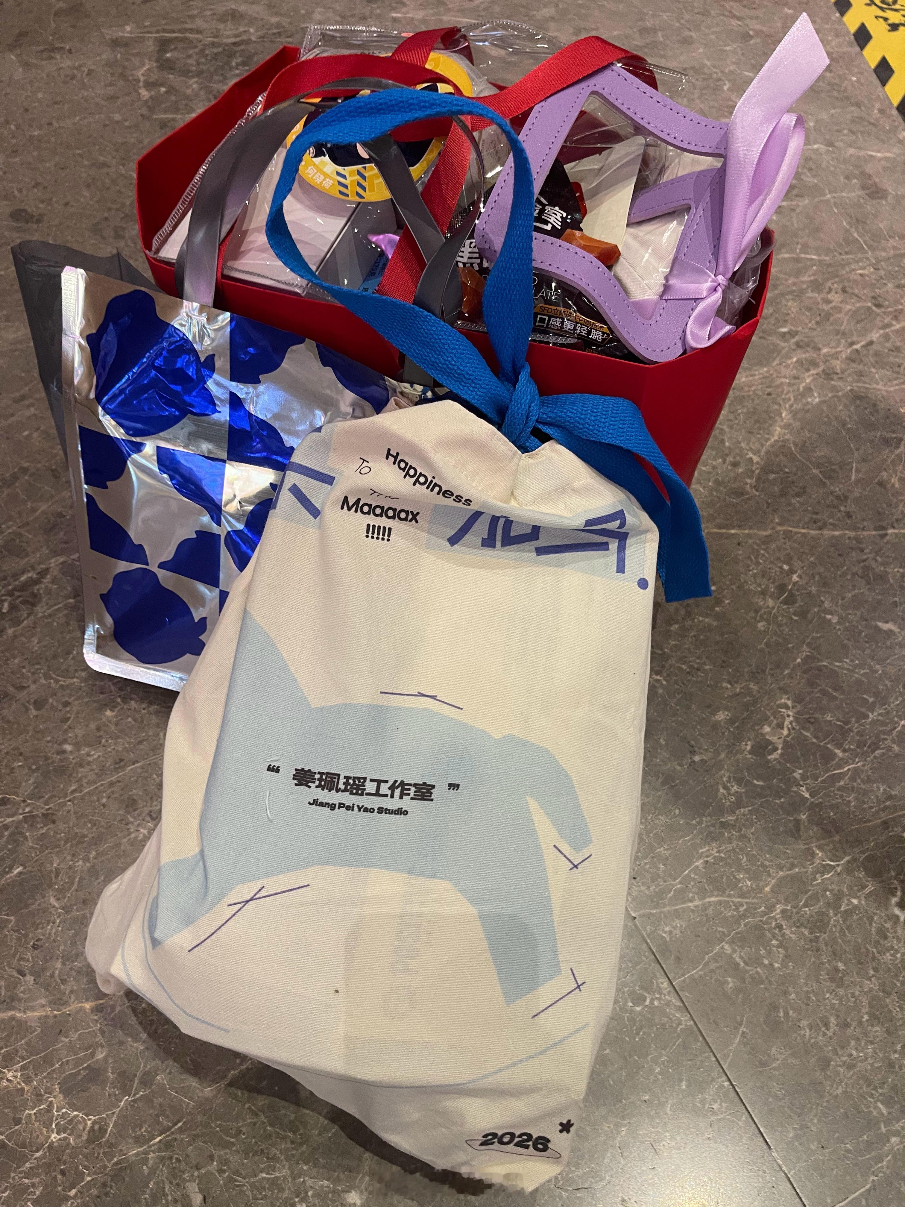 黑夜告白 已就位,剧方送的伴手礼太丰富了,三兜子。天挺热的,姜佩瑶团队送了凉奶茶,贴心。一会儿看完片,等着见王鹤棣,开森。