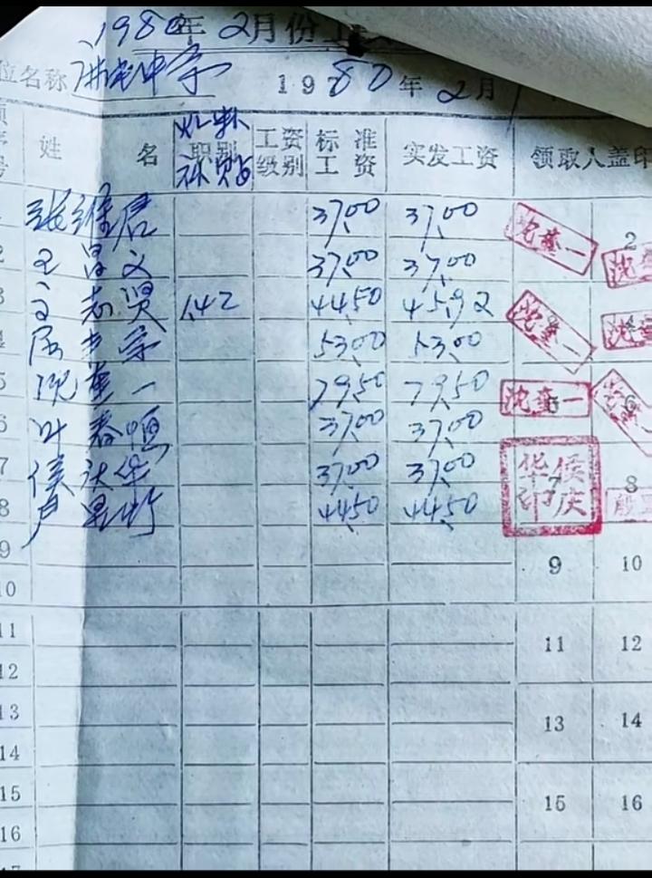 这是上世纪七十年代末、八十年代初期一所中学的教职员工工资表,可以看出,大家的月薪都是几十元,最高72.8元,估计是校长级别吧。最低也有37元。 就是这几十元就要养活一大家人! 记得当时的大米是一毛三分八一斤,猪肉是七毛六一斤。 学生每学期的学费每人仅是几块钱,一次缴清不再有其他收费。没有现在那些杂七杂八、名目繁多的缴费。