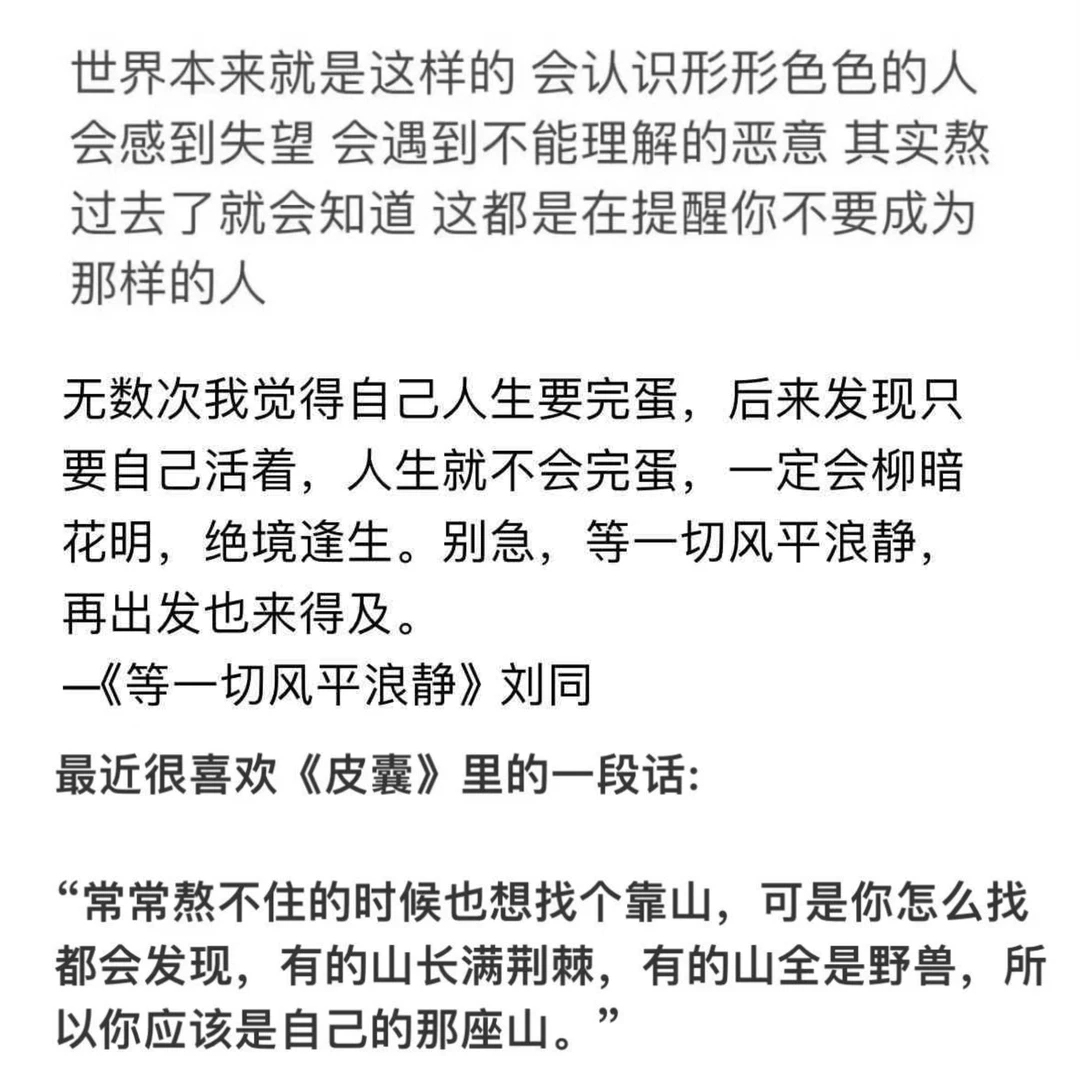 🤓人到了一定年纪,慢慢就不再较劲了。 不再纠结遗憾,不再强求关系,不再为难自己。 🌳接受世事无常,接受聚散不由人, 接受付出未必有回报,接受平凡与不完美。 😊允许情绪起落,允许事与愿违, 允许有的人来,有的人走。 🤓不强留、不内耗、不执念, 降低期待,看淡得失, 心一旦松弛下来,日子就顺了。 😃与生活和解,与自己释怀, 允许一切发生,方能自在从容。
