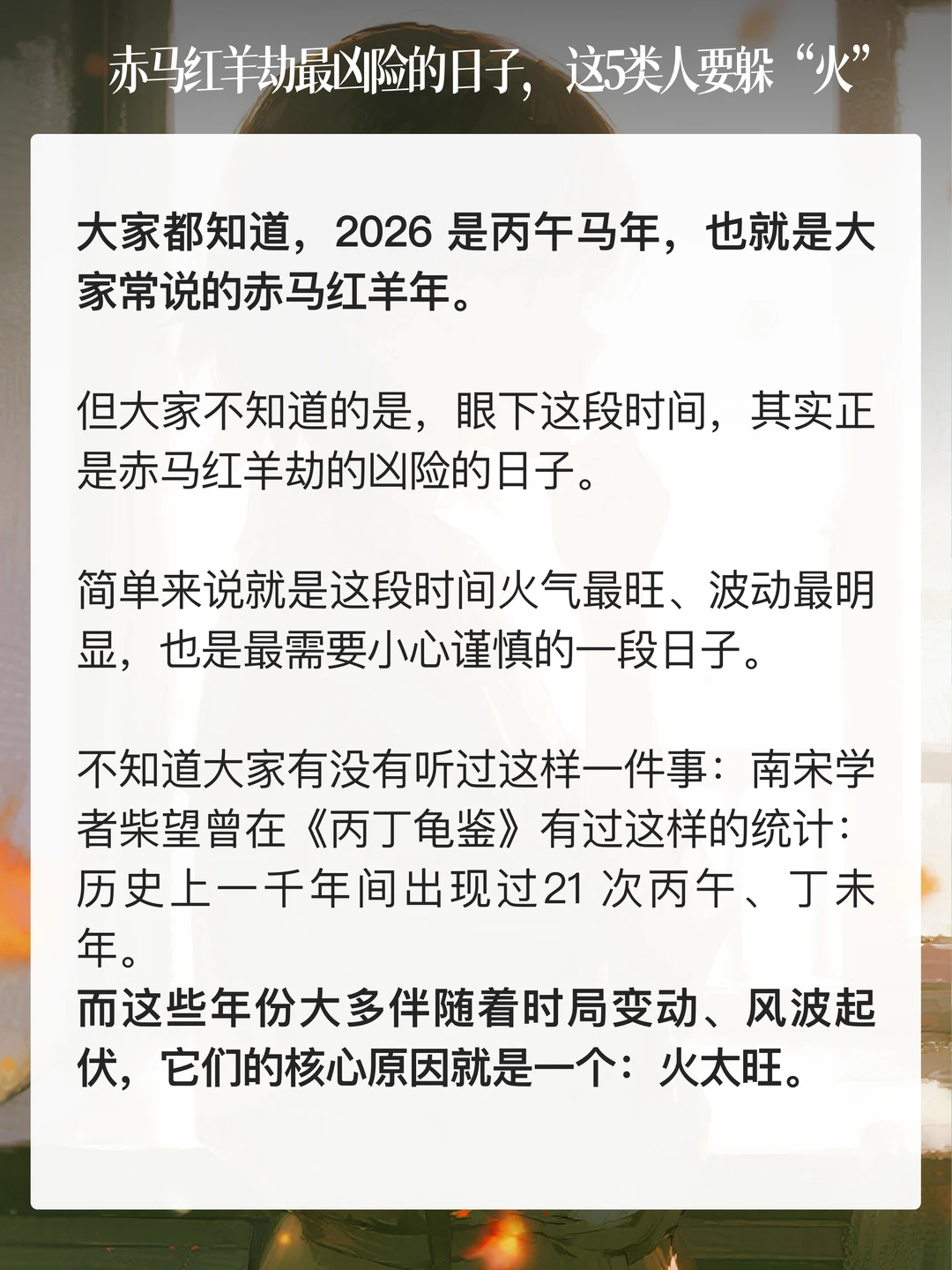 大家都知道,2026 是丙午马年,也就是大家常说的赤马红羊年。 但大家不知道的是,眼下这段时间,其实正是赤马红羊劫的凶险的日子。 简单来说就是这段时间火气最旺、波动最明显,也是最需要小心谨慎的一段日子~