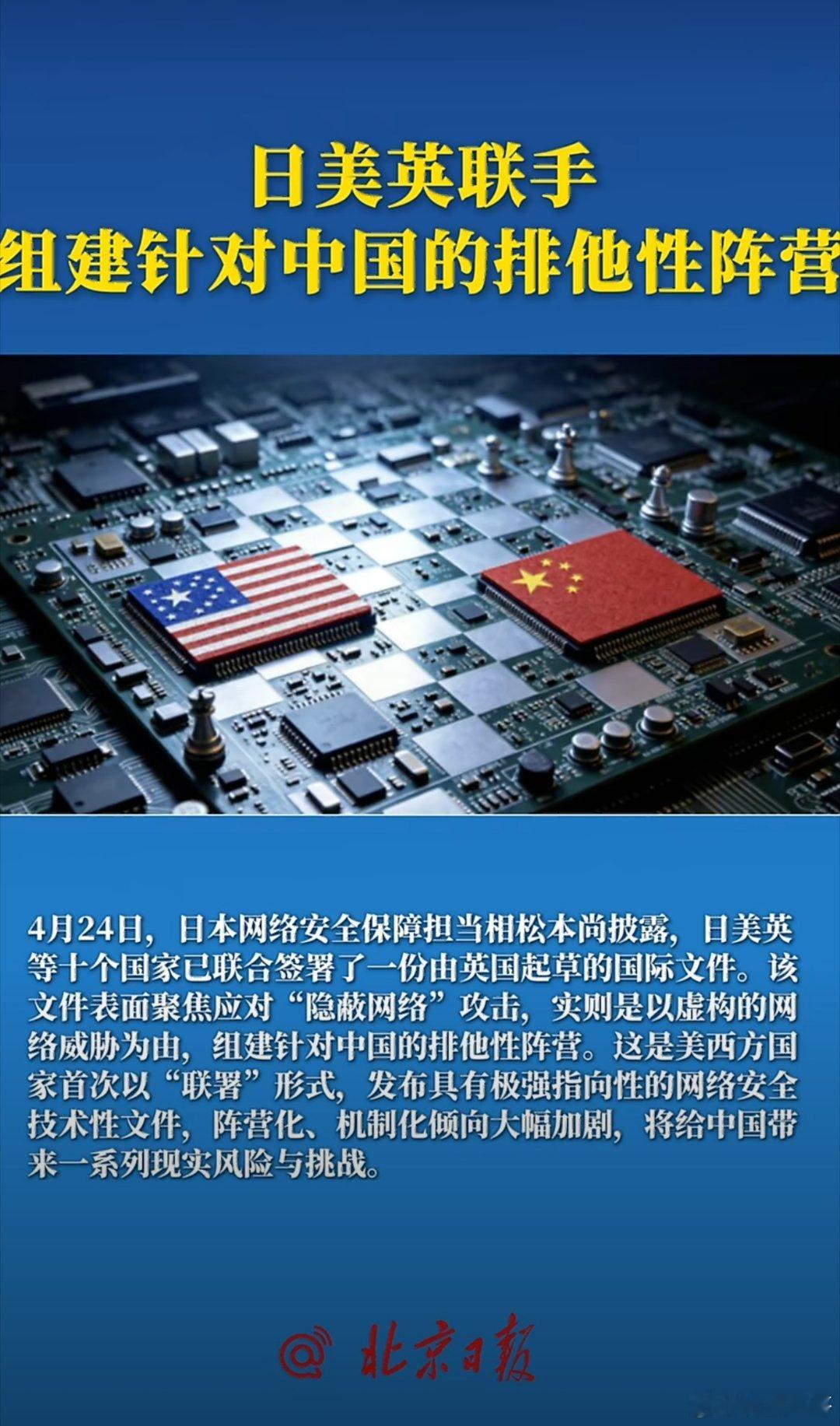 日美英等十国联手针对中国!4月24日,日美英等十国签署英国起草的网络安全文件,借防范隐蔽网络攻击之名,拼凑排他性遏华小圈子。以五眼联盟为核心、欧洲国家为辅、日本锚定亚太,分层协作。各方凭空捏造网络威胁,借供应链安全制造技术壁垒,延续美国打压中企的套路。此举将加剧我国网络安全风险、抬高防护成本,加码科技围堵,阻碍数字产业出海,严重撕裂全球网络治理体系。日美英联手针对中国