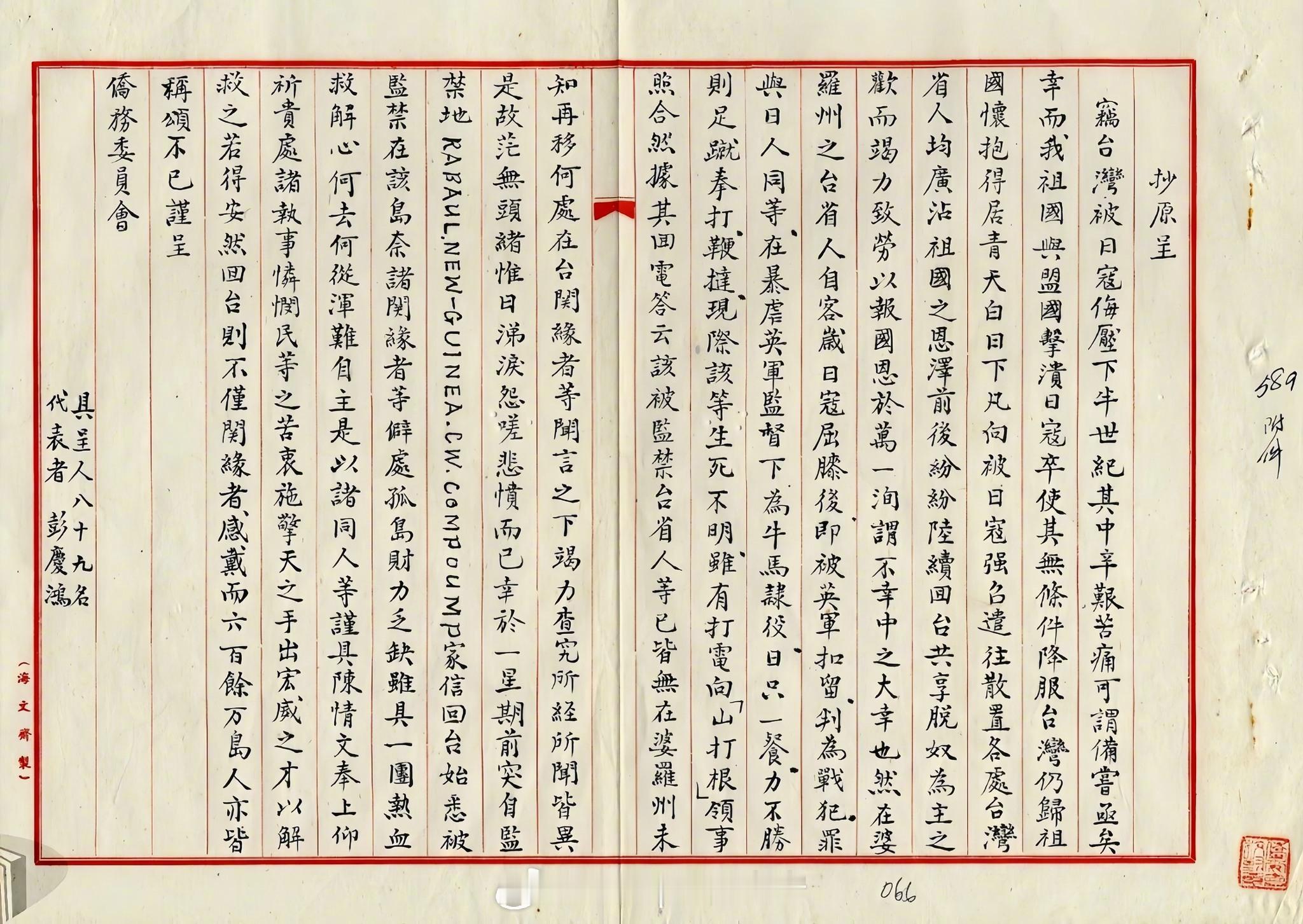 照片中的历史 这份文件是1947年,台湾人彭庆鸿向民国外交机构求救的电文,彭庆鸿的儿子彭锦良是台籍日本兵,当时包含彭锦良在内共有89名台籍日本兵、军属或战俘监视员遭英军囚禁在婆罗洲。电文中提到,台籍战犯一天只吃一餐,还遭到看守的英军殴打,生死未卜。据史料记载,彭庆鸿的儿子彭锦良最终死在南洋监狱中,未能见到父亲。史料记载的婆罗洲台籍战俘监视员暴行:二战期间,日本从台湾征召大量青年前往婆罗洲担任战俘监视员,其中部分人参与了虐待、处决盟军战俘的暴行。这些行为在战后被盟军军事法庭审判,成为日本殖民台湾历史中不可回避的黑暗一页。根据澳大利亚军事法庭纪录,台籍战俘监视员主要被派往婆罗洲的山打根、亚庇等地战俘营,负责看管英、美、澳等国战俘。他们在日军指挥下,强迫战俘在饥饿状态下从事重体力劳动,如挑砂石、挖地洞、建机场。部分台籍监视员因急于证明对日本的忠诚,对俘虏的虐待甚至超越日军。例如,台籍监视员柯景星等人在山打根死亡行军中,依日军命令集体射杀盟军战俘。这类暴行导致盟军战俘死亡率高达27%,是纳粹战俘营的7倍。因此在二战结束后,台籍日军(军属)被盟军视为与日军同等的战争罪犯,并接受 B、C 级战犯审判。根据统计,共有173名台籍战犯被起诉,其中26人被判处死刑。