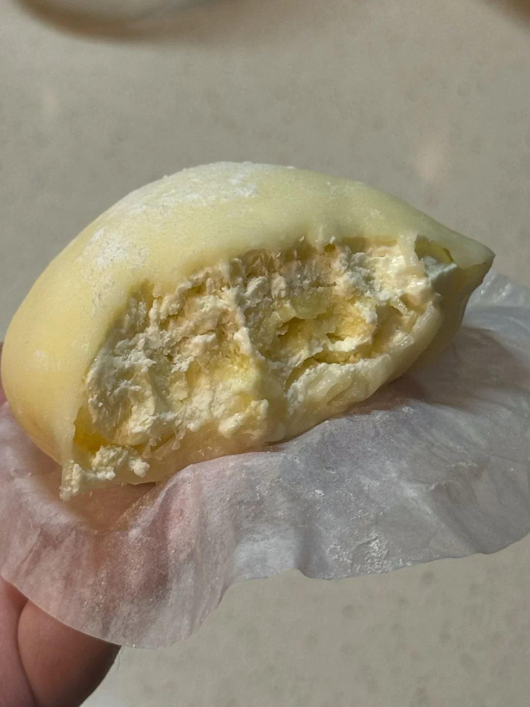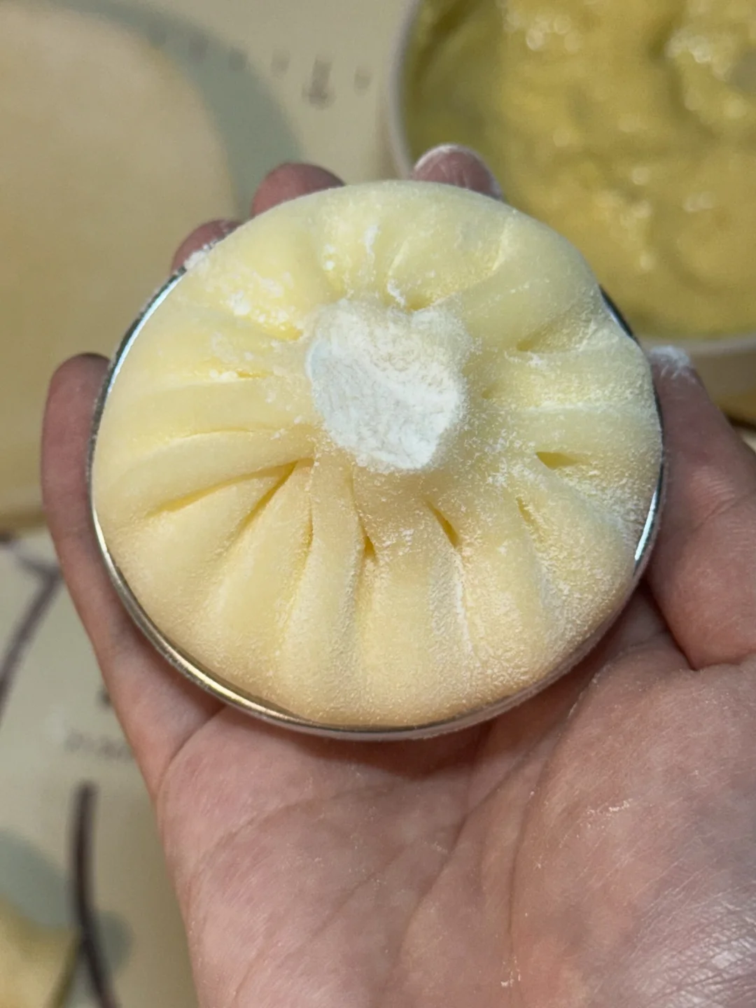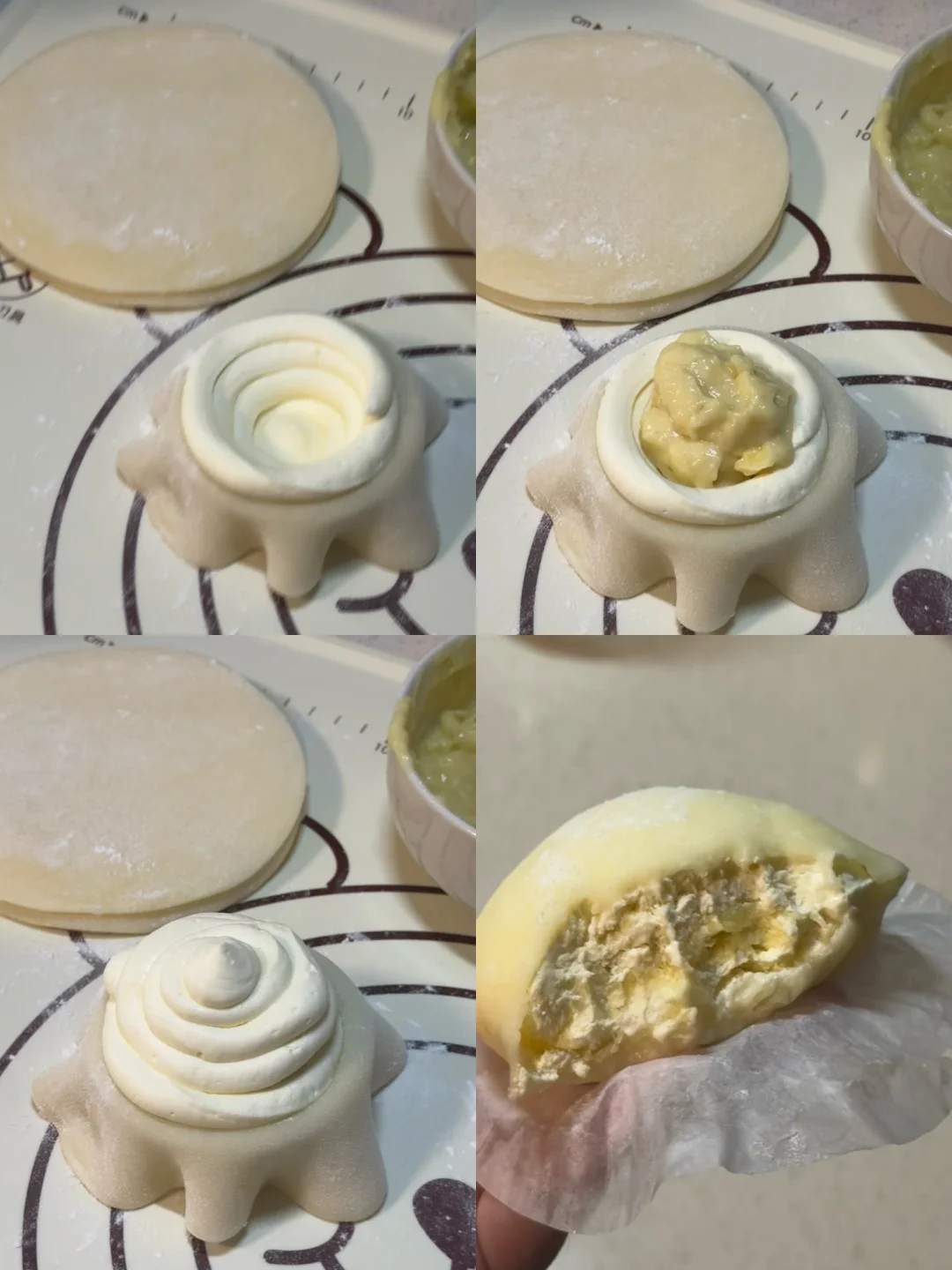 6.擀好的面皮放入模具中,挤上奶油、放入榴莲果肉,包包子一样包住,多余的用剪刀剪掉。做好的雪媚娘可以放冰箱冷藏一小时后再享用(也可以放冷冻半小时再吃,口感就跟吃冰淇淋一样,超级好吃)