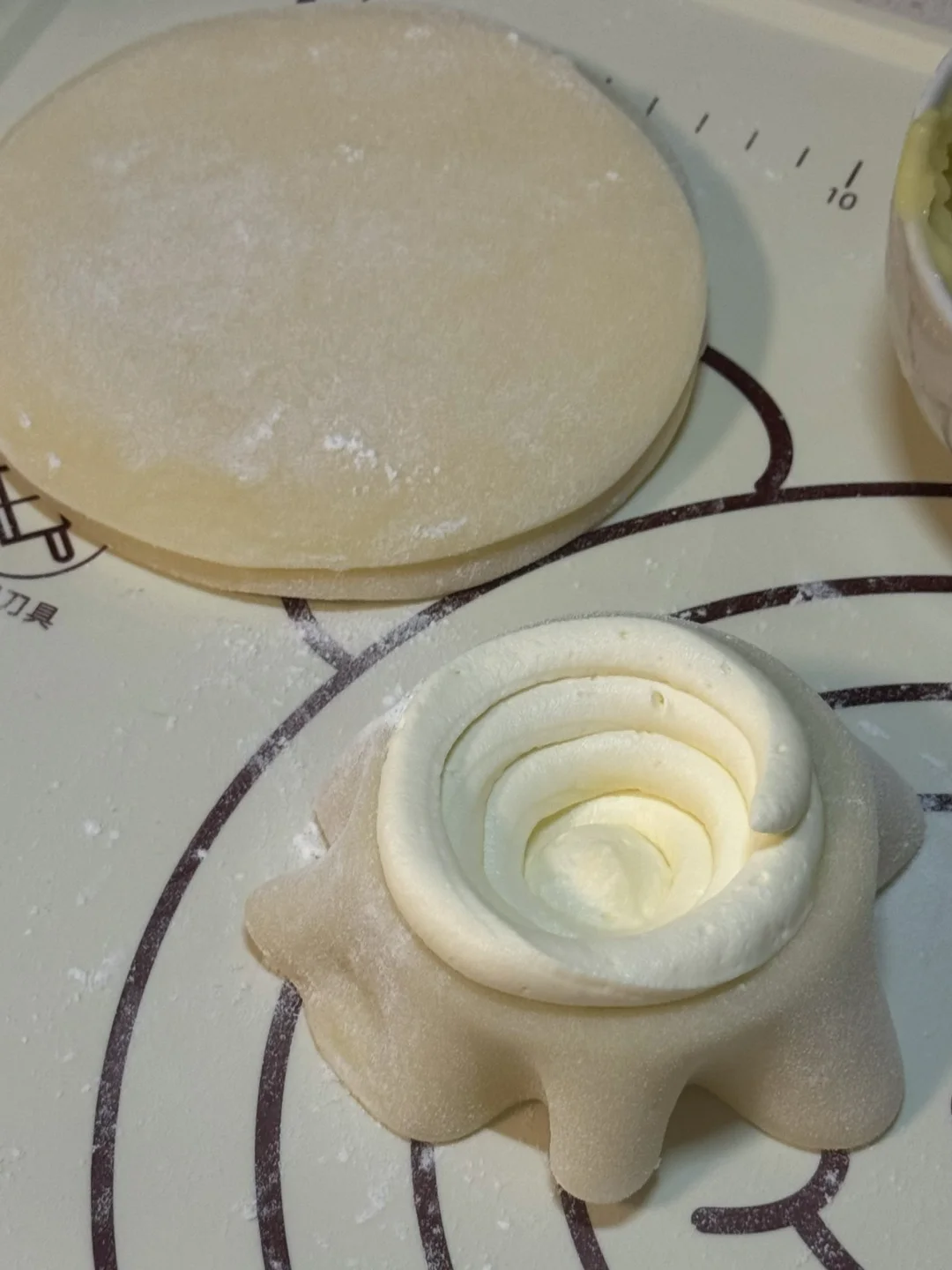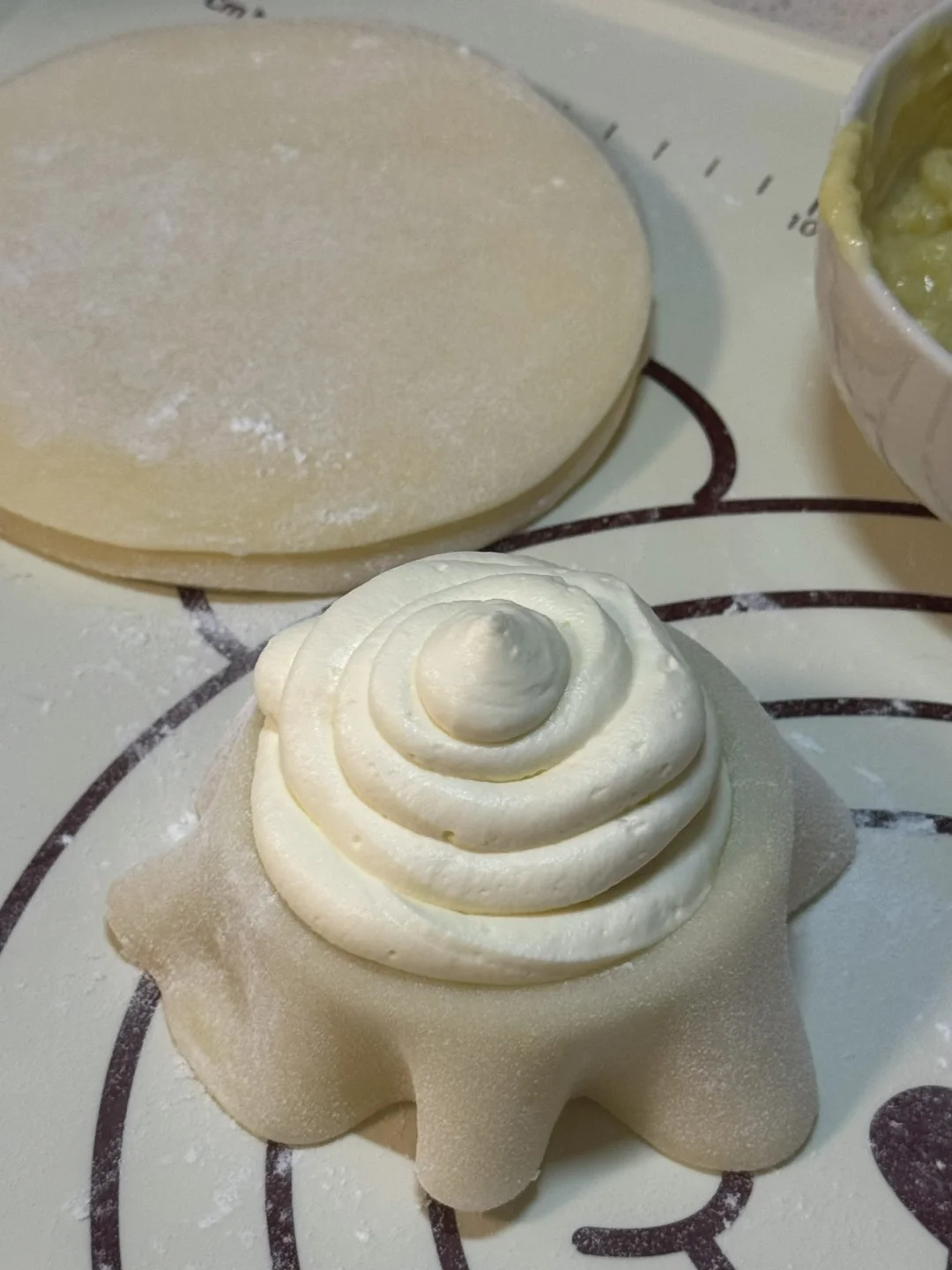 3.提前炒一些糯米粉备用,擀皮的时候,在分好的小剂子裹一层糯米粉就不会粘了,擀面杖也裹一层,擀至中间厚四周薄也不用特别大,擀薄擀圆,挤奶油的时候,先挤一层奶油再放入爱吃的水果或者饼干碎,再挤一层奶油(想让雪媚娘饱满圆润一定要借助模具,最下面的那一层奶油可以多挤点,这样子做出来的雪媚娘就会很漂亮)如果天气热记得屋里开空调操作,做好一个放冰箱冷藏,奶油也同理(挤一好一个放入冷藏一会儿再继续下一个,就可以防止软塌)