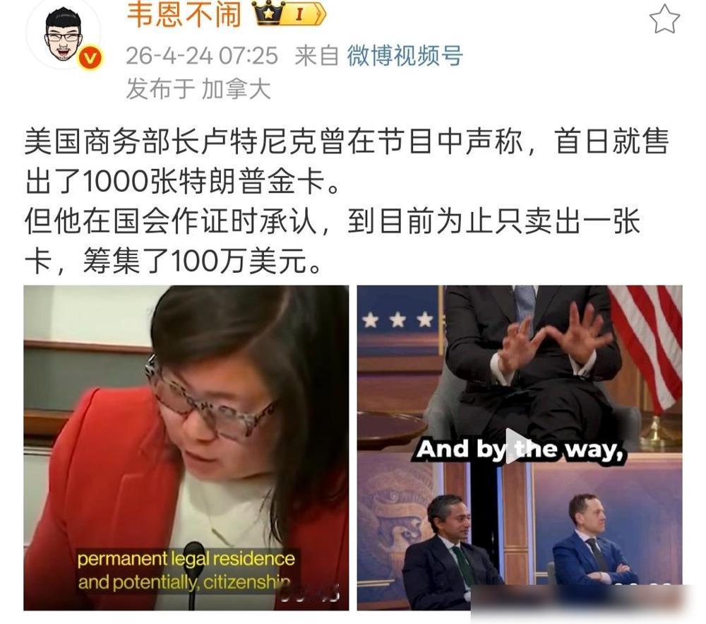 “只卖出去一张” 锣鼓喧天开场销售的“特朗普金卡”, 号称 “只卖出去一张” 锣鼓喧天开场销售的“特朗普金卡”, 号称即买即送绿卡的特朗普金卡, 号称首日开售即卖出了1000张的特朗普金卡, 实际销售情况是: 美国商务部长在国会作证时承认,到目前为止只卖出一张,即100万美元。 这牛皮吹破的样子也太好笑了,之前造势造得那么凶,又是承诺买卡就送美国绿卡,又是吹开售首日就卖了一千张,合着全是自导自演的营销套路,也就到了国会作证不敢瞎说话,才把真实底裤给露出来。 之前网上还传过唯一的买家是国内某路由器厂商的大佬,也不知道消息准不准,要是真的花100万美元买这么张卡,属实是让人摸不着头脑。 说白了这种所谓的名人专属金卡、特权卡,本质上就是割有钱人韭菜的智商税,什么特权福利全是虚头巴脑的噱头,咱们普通人看看热闹就好。