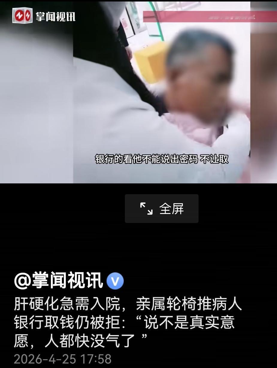 肝硬化病人急需入院,亲属能以推病人去银行取钱仍然遭拒! 看完完整视频之后发现了问题,虽然是亲属,但是是表亲,同时又不能提供密码。 在视频中也没有说明为什么这个肝硬化的病人自己不把密码说出来,银行的说法似乎也有一定的道理。 各位是怎么看的?欢迎评论区留言。