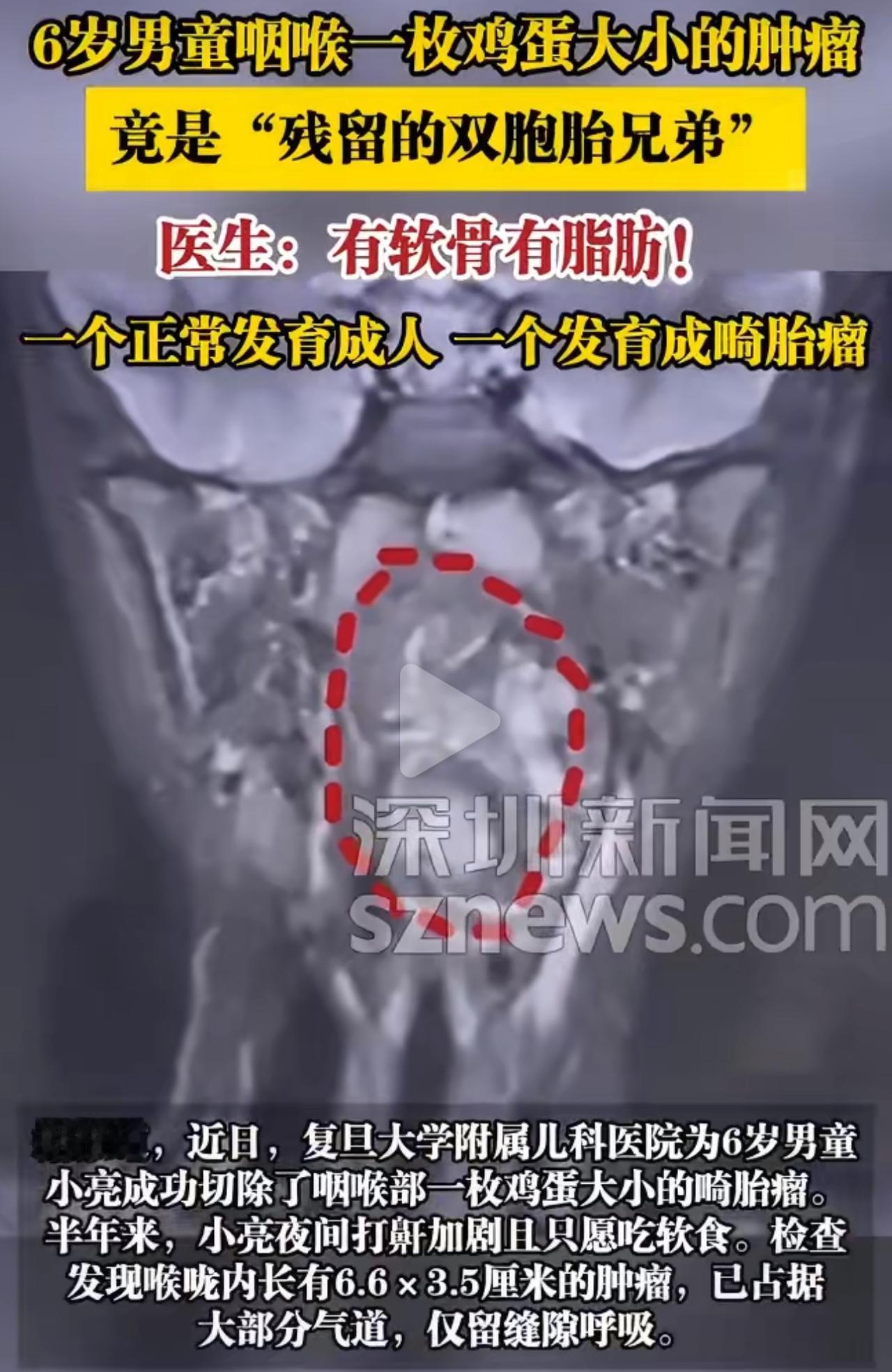 小男孩小亮,这大半年睡觉鼾声大得离谱,整夜翻来覆去睡不好,吃饭也特别挑,只肯吃面条、稀饭,但凡有点硬度的东西,一口都不肯吃。 爸妈一开始没当回事,只觉得是孩子挑食、睡觉不老实,可越往后越觉得不对劲,看着孩子吃饭费劲、呼吸也不畅,心里又着急又担心,赶紧带孩子去了医院。 这一查可把全家人吓得不轻,孩子咽喉旁边长了个超大的畸胎瘤,差不多把气道堵了80%,再晚来一步,随时都有可能窒息! 网上传的“双胞胎残留”,其实就是医生怕家长听不懂,打的通俗比方,压根不是什么寄生胎。 说白了就是孩子自身细胞发育异常,长了个良性畸胎瘤,长在咽喉这个位置,全世界都没几例,特别罕见。 肿瘤挨着大动脉,手术风险特别高,好在医生顺利把肿瘤完整切了下来。术后才5天,孩子就不打鼾了,还主动要吃馒头,终于恢复了正常。 好多家长都踩过坑,孩子长期打鼾、拒吃硬东西,总以为是小毛病、是矫情。 千万别大意!这很可能是气道被压迫的危险信号,调理没效果就赶紧做全面检查,早发现早治疗,千万别拿孩子的健康赌!少儿打鼾 难眠的男孩 咽喉肿瘤