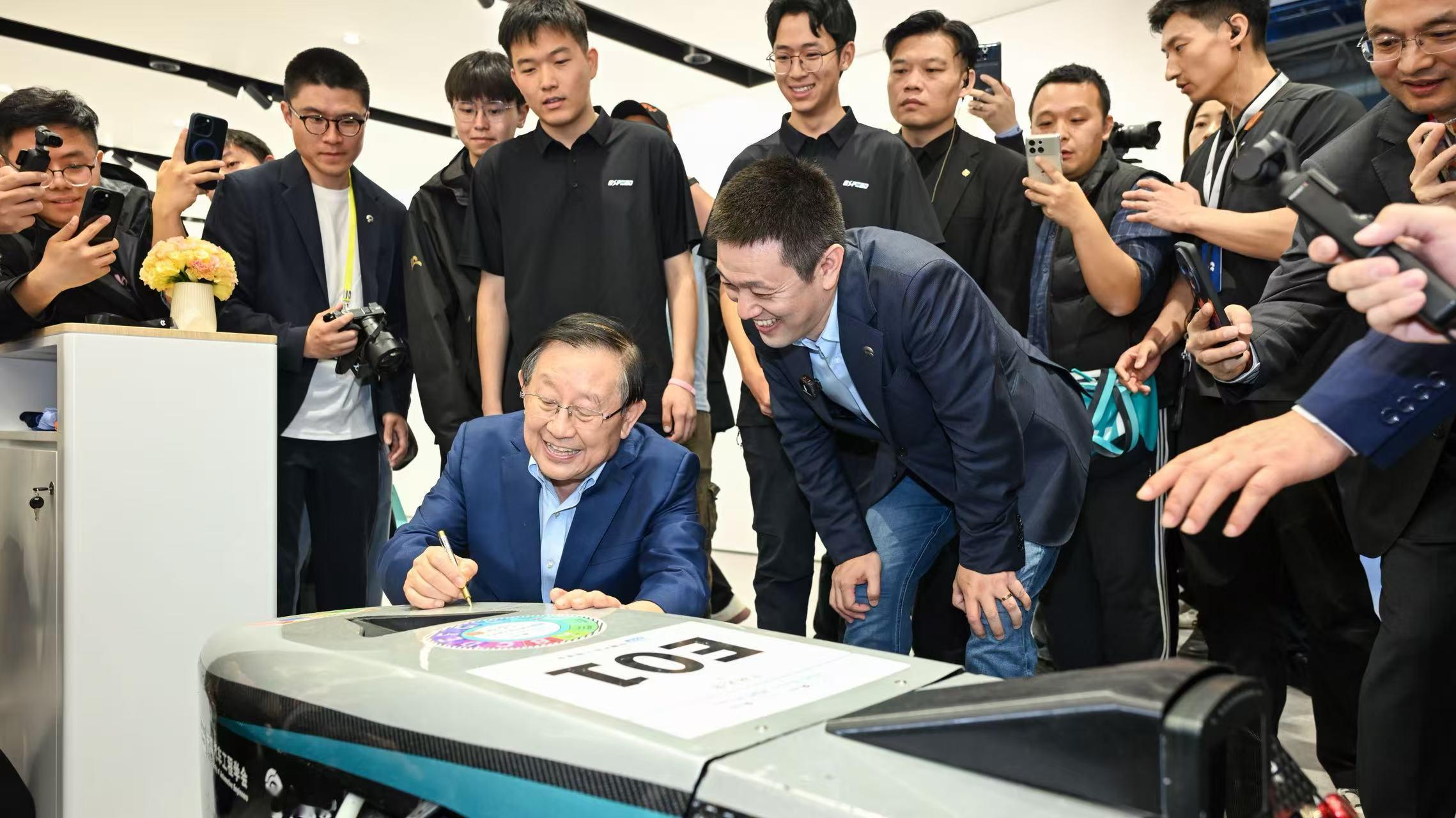 24号上午,万钢校长也到蔚来展台,在吉大的冠军赛车上签名寄语:“加电创未来”。蔚来的通稿中说:中国大学生方程式系列赛事始创于2010年,由中国汽车工程学会与李斌联合发起。