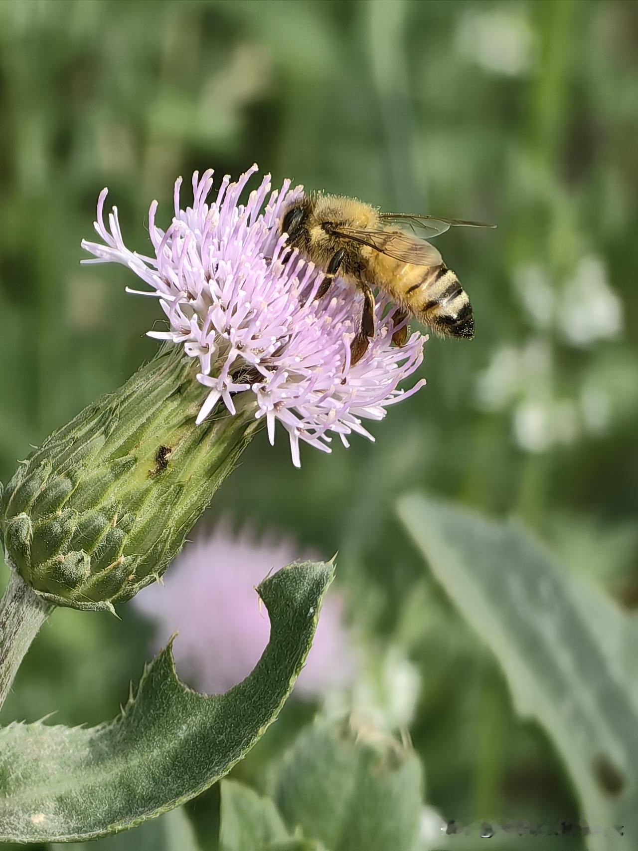 一朵野花上,小蜜蜂正在觅食,感觉特别有趣,于是用手机抓拍了下来。