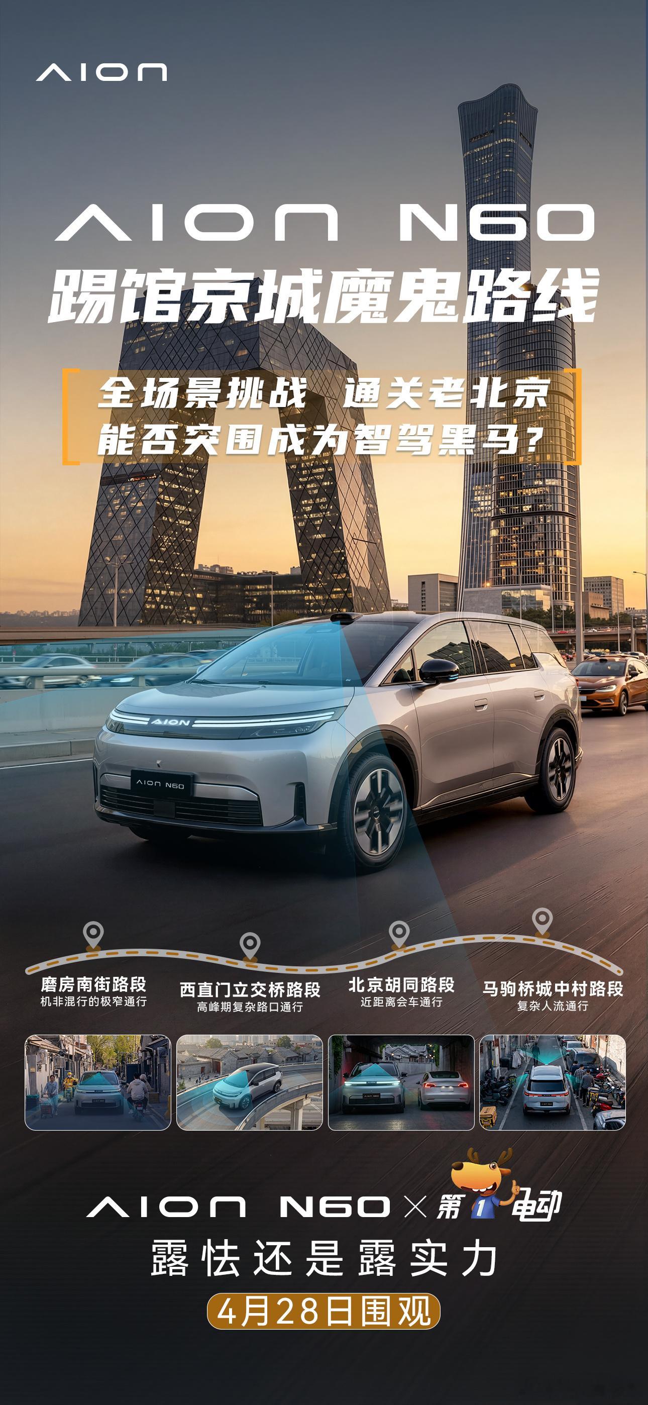 广汽埃安N60 智驾行不行,上路试试才知道。埃安N60踢馆北京30万级智驾车同款魔鬼路线,城中村窄巷机非混行,西直门立交桥车流博弈,北京老胡同极窄会车。4月28日,等你围观!智能驾驶 第二届中国智驾大赛
