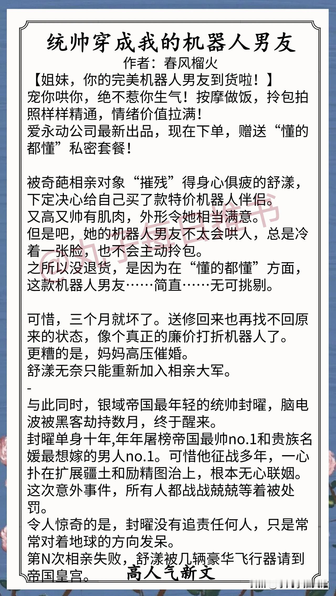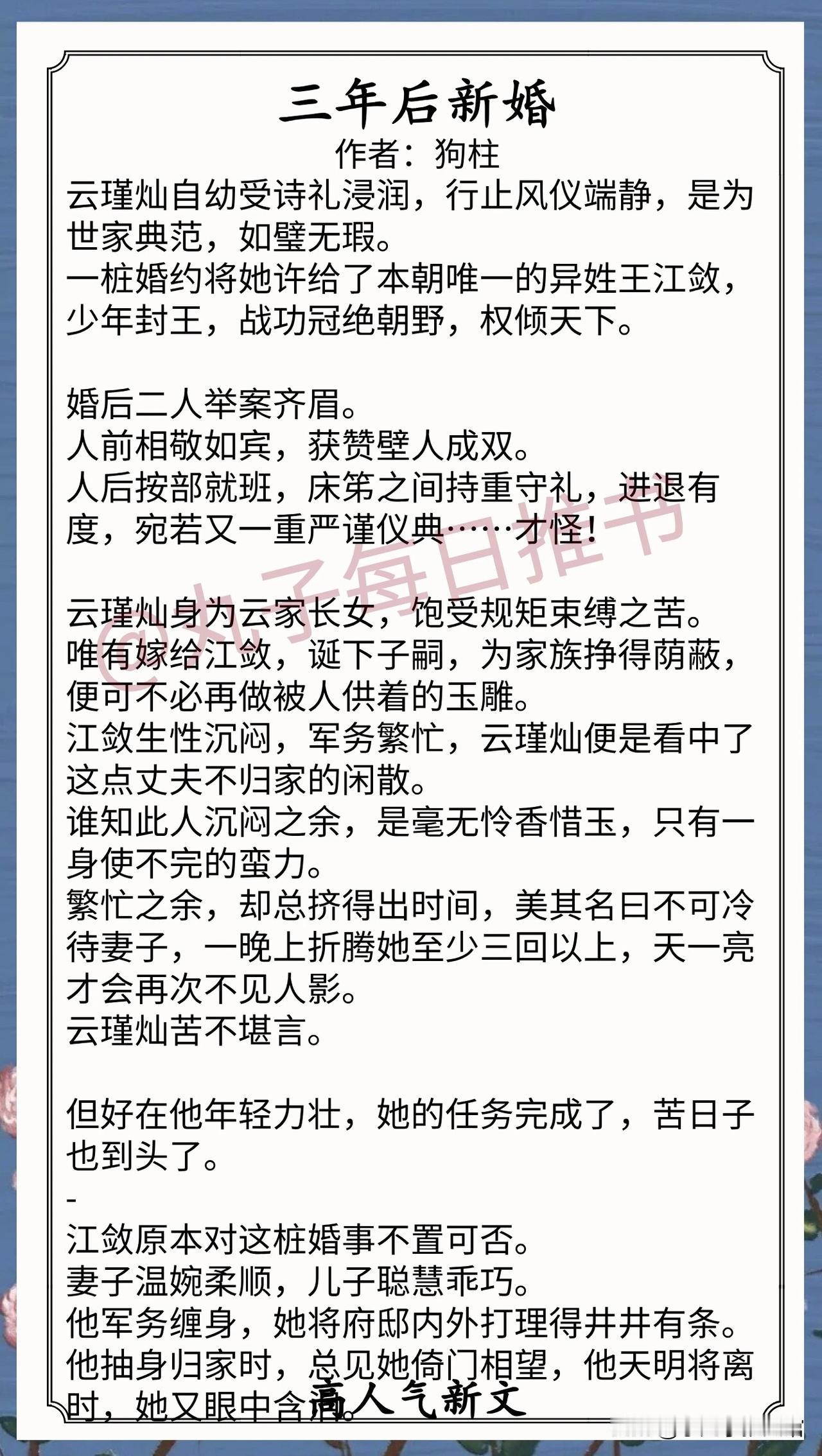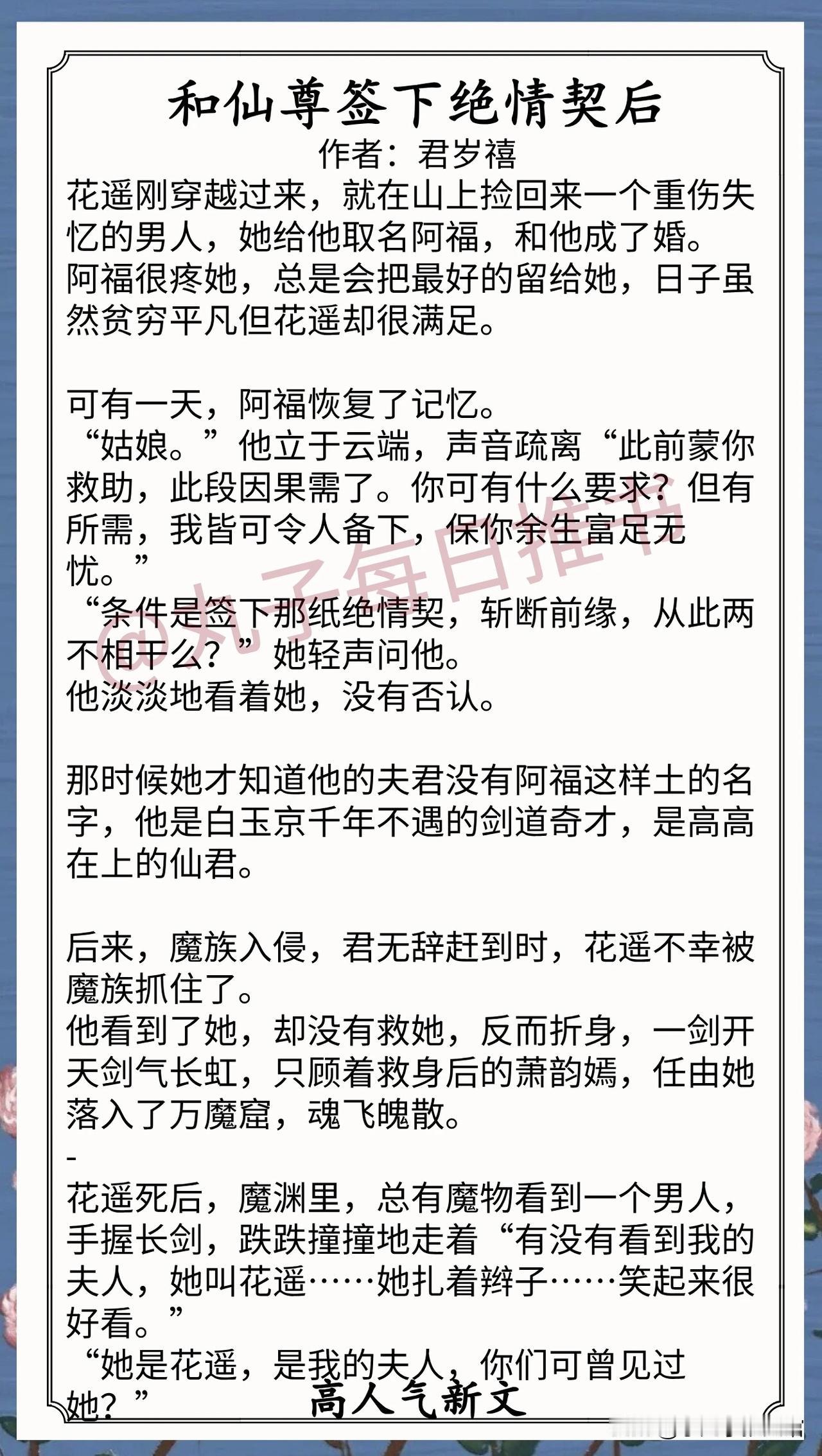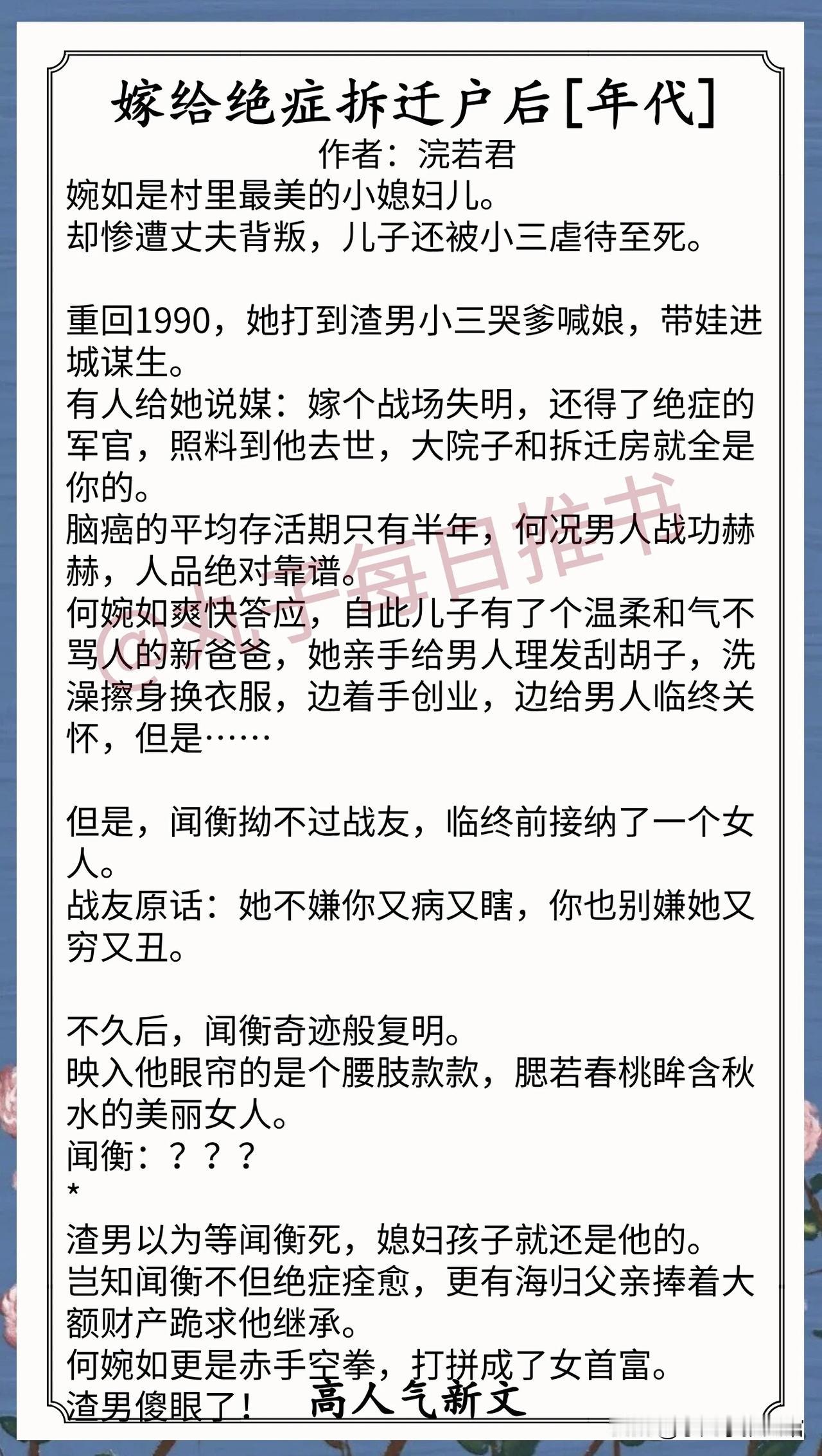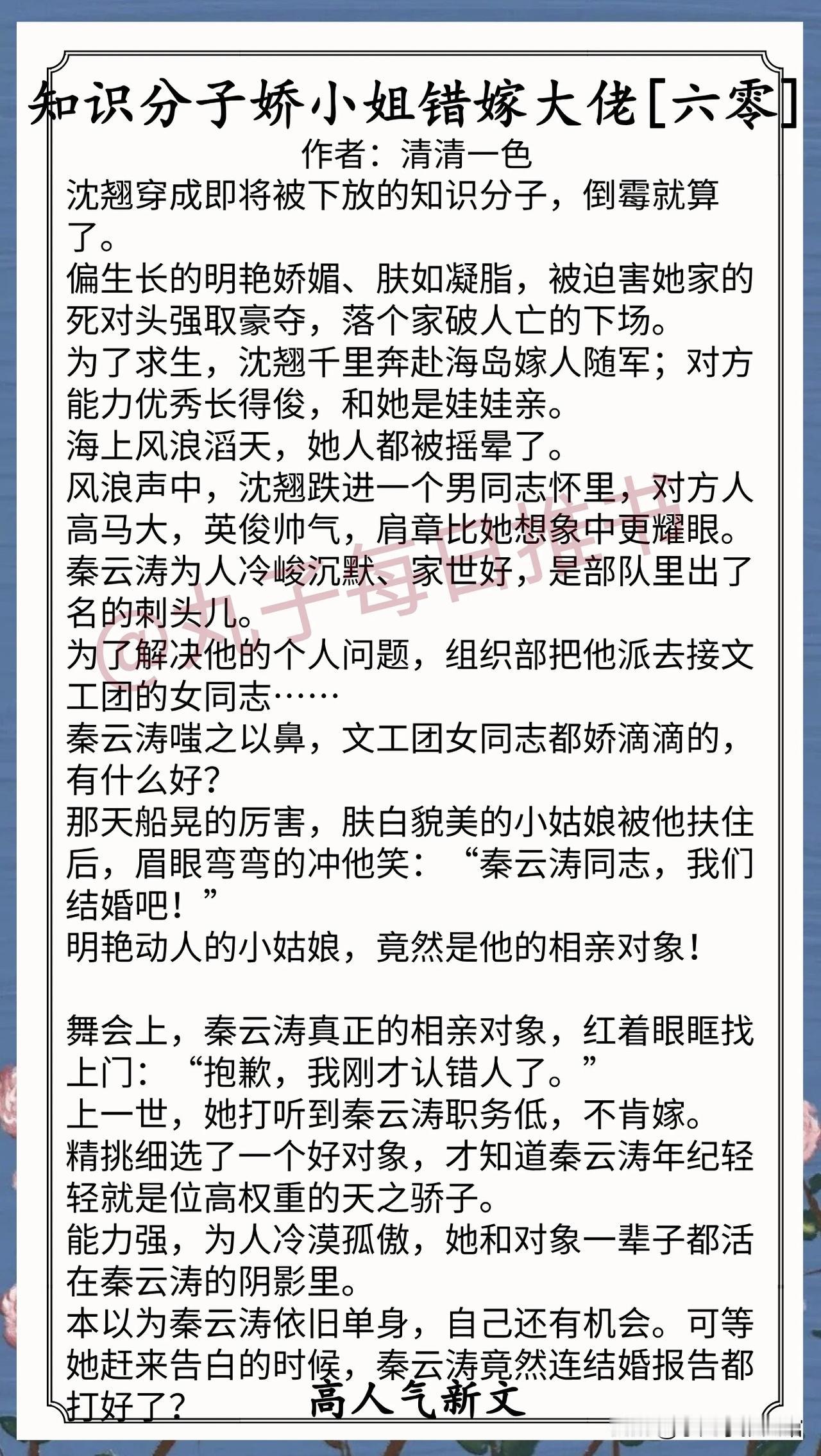 [彩虹]人气最新完结好文[送自己一朵花] 1. 《反派夫妇作死日常》作者:公子闻筝(一心苟命vs满级大佬,穿书,反派逆袭,仙侠修真文,轻松沙雕风) 2. 《嫁给绝症拆迁户后》作者:浣若君(暴躁美人vs绝症军官,重生,打脸虐渣,先婚后爱,年代甜爽文) 3. 《慕色不迟》作者:榛意(假乖乖女vs真豪门大佬,带球跑,先孕后爱,都市甜宠文) 4. 《三年后新婚》作者:狗柱(骄矜美人vs寡言王爷,婚内追妻,轻松甜宠文) 5. 《统帅穿成我的机器人男友》作者:春风榴火(单纯人类小可爱妹宝vs杀伐决断的冷血帝国领袖,阴差阳错,人外甜宠文) 6. 《知识分子娇小姐错嫁大佬后》作者:清清一色(落难美人vs帅气军官,穿书,阴差阳错,先婚后爱,60年代甜宠文) 7. 《和仙尊签下绝情契后》作者:君岁禧(凡女vs仙尊,穿越,婚恋,满级火葬场,仙侠修真文) 8. 《甜蜜沼泽》作者:椰迩(貌美乖张大小姐vs清隽阴郁穷小子,寄住,男你来女,破镜重圆) 9. 《汴京生活日常》作者:东边小耳朵(二嫁厨娘的女儿vs八品校书郎,穿越,先婚后爱,宋朝市井生活)小说 推文
