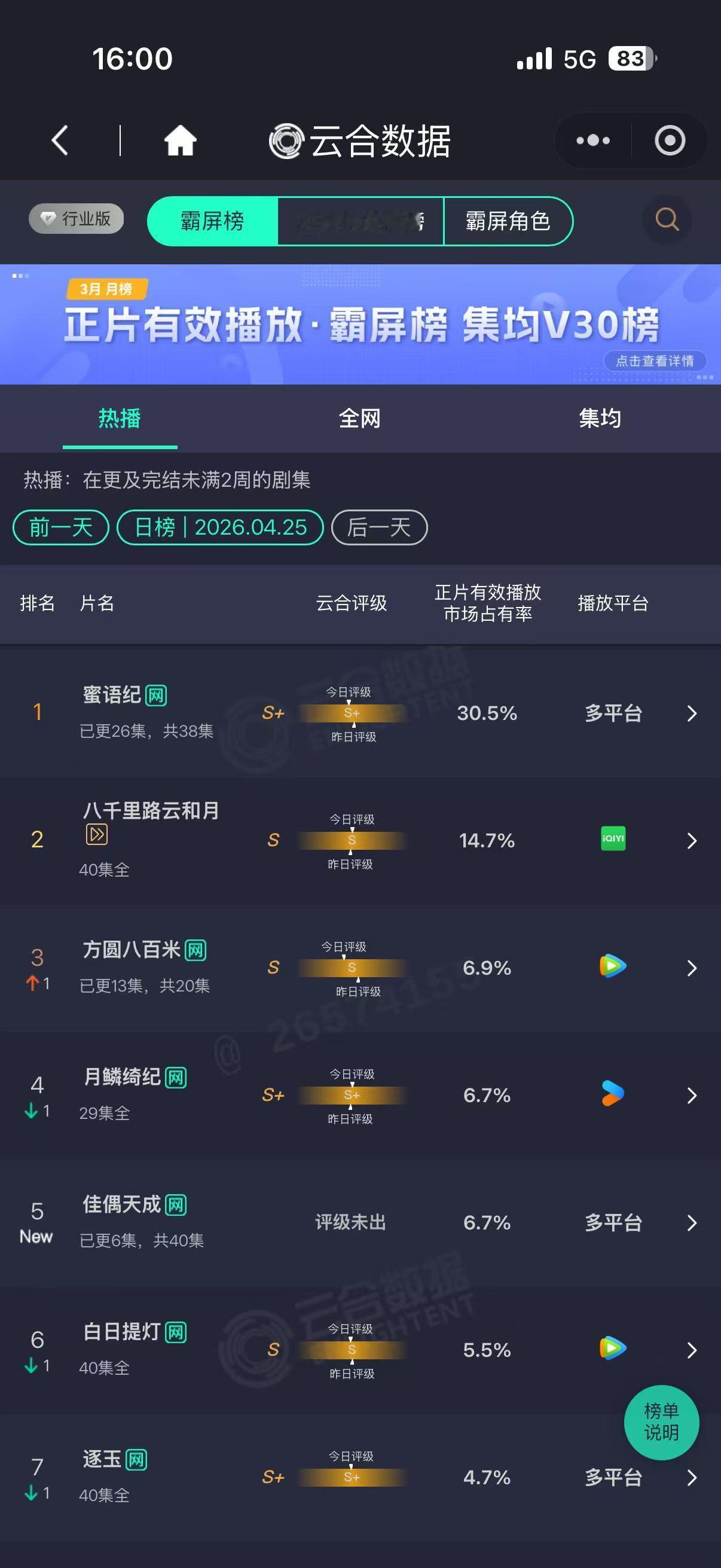 蜜语纪市场占有率高达30.5%,霸屏角色纪封TOP1、许蜜语TOP2、檀寄舟TOP5、鲁贞贞TOP6,蜜语纪实🔥🔥🔥