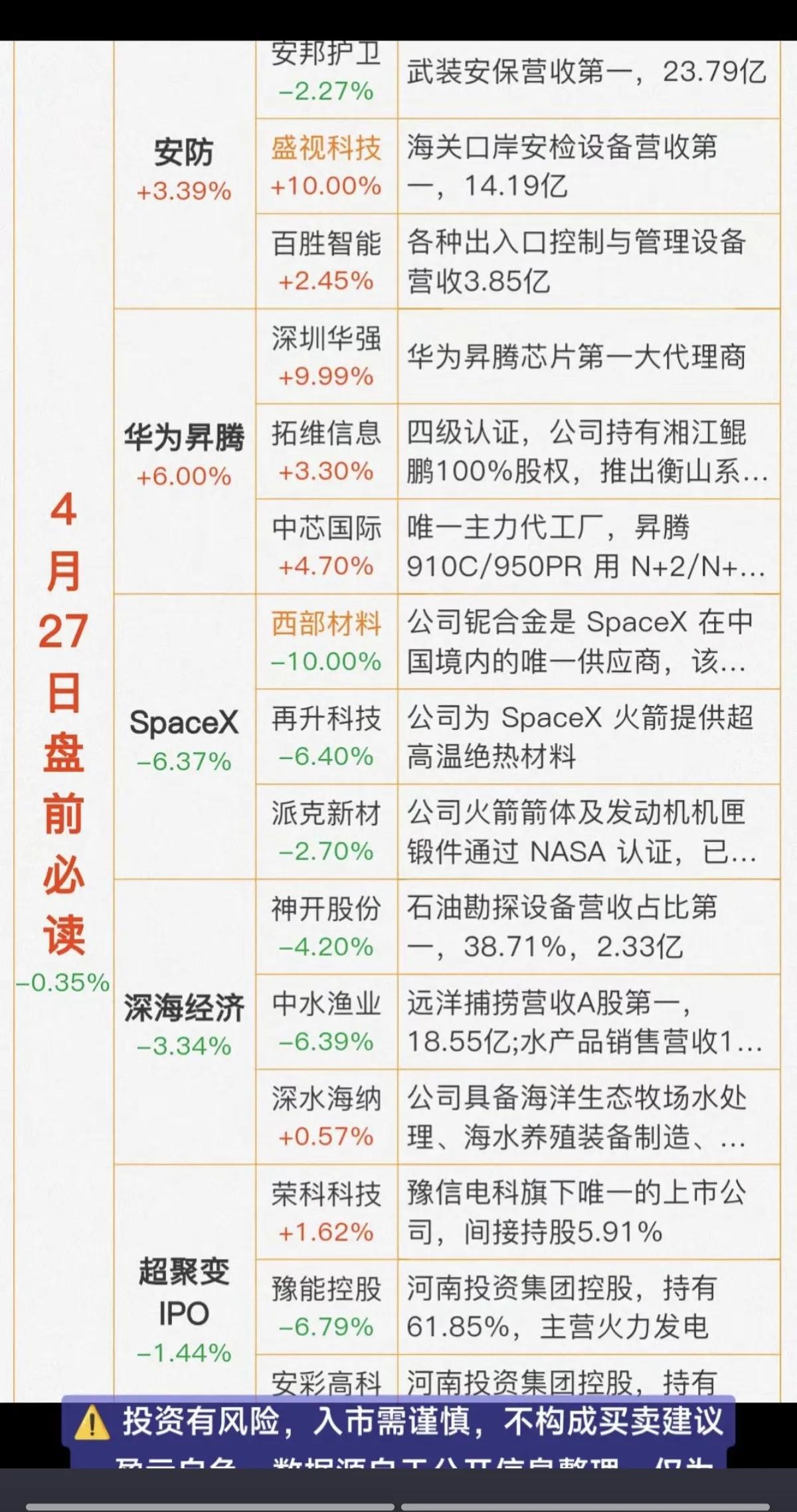 4.27盘前必读!五大方向梳理🔥 盘前消息密集发酵,AI、商业航天、深海经济等主线迎来催化,相关方向标的整理好了,一起看看! 📌 核心消息速览 1. DeepSeek打响AI价格战,百万Token输入仅0.25元,算力赛道热度再升温; 2. 美国太空军披露“金穹”合同,SpaceX等12家公司获32亿美元订单,商业航天受关注; 3. 国务院会议推动海洋经济高质量发展,深海经济迎来政策利好; 4. 超聚变完成IPO辅导,国产服务器产业链再添催化剂。 📌 主线方向梳理 ✅ 华为昇腾/AI算力:深圳华强、拓维信息、中芯国际等持续走强,受益于DeepSeek降价与昇腾生态扩容,算力国产替代逻辑强化。 ✅ 商业航天/SpaceX:美国太空军订单落地,相关供应商再升科技、派克新材等迎来事件催化。 ✅ 深海经济:神开股份、中水渔业、深水海纳等受益于海洋经济政策利好,相关业务线有望迎来增长。 ✅ 安防板块:盛视科技、安邦护卫等受突发消息催化,板块情绪异动。 ✅ 超聚变IPO:荣科科技、豫能控股等参股企业,受益于服务器龙头IPO进程。 整体来看,市场主线清晰,AI算力、商业航天仍是资金博弈焦点,消息催化下相关板块或迎来异动。以上内容仅为公开信息整理,不构成投资建议,大家理性看待波动,控制好节奏~ A股盘前分析 AI算力 商业航天 深海经济