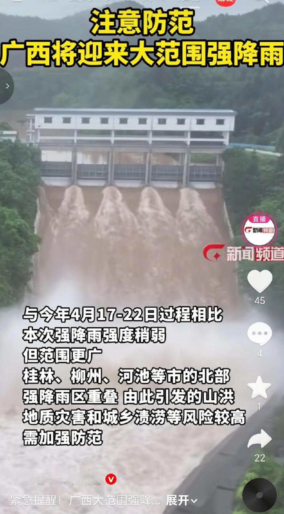 据广西气象台预计,4月26日夜间至28日,广西自北向南将有一次大雨、局地暴雨或大暴雨过程,伴随强对流天气。过程累计雨量方面,桂北50~120毫米,局地200毫米以上;桂南20~60毫米。与今年4月17 - 22日的降雨过程相比,本次强降雨强度稍弱,但范围更广,桂林、柳州、河池等市的北部强降雨区重叠,由此引发山洪、地质灾害和城乡渍涝等风险较高,需加强防范。(来源于@广西气象)