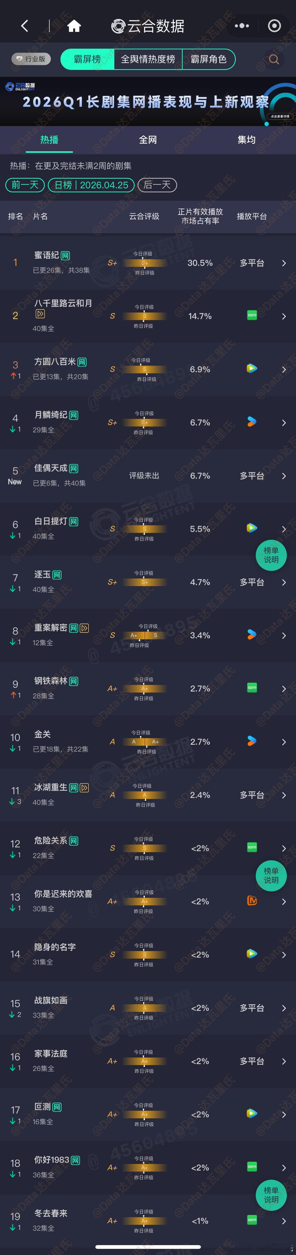 4.25云合占比蜜语纪 30.5%,约5390万八千里路云和月 14.7%,约2600万方圆八百米 6.9%,约1220万月鳞绮纪 6.7%,约1185万佳偶天成 首日云合6.7% 约1185万白日提灯 5.5%,约970万逐玉 4.7%,约830万