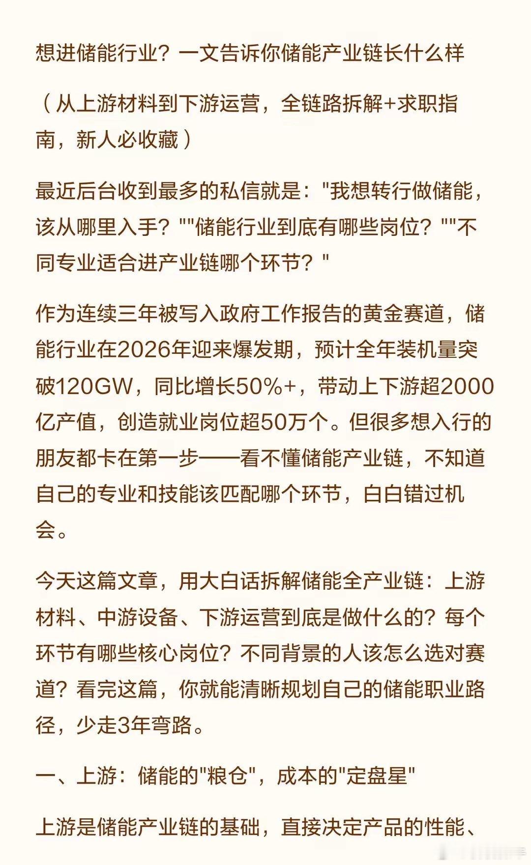 想进储能行业?一文读懂储能产业链🎈2026年,储能行业迎来真正的"黄金时代"——政策红利持续释放,市场机制逐步完善,三重收益闭环(容量+电能量+辅助服务)让储能项目IRR稳定在8%-12%,成为投资新宠。✨无论你是材料、电气、计算机等理工科背景,还是能源经济、金融、管理等文科背景,甚至是非专业想转行的朋友,都能在储能产业链找到适合自己的位置。关键是要先看懂产业链,选对赛道,然后通过学习和实践提升技能,抓住这个万亿级市场的机遇。财经