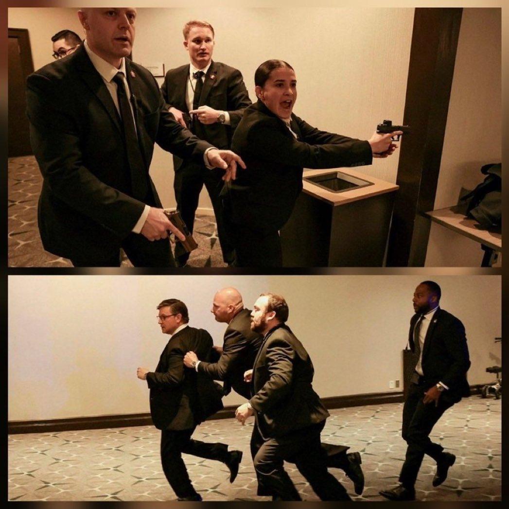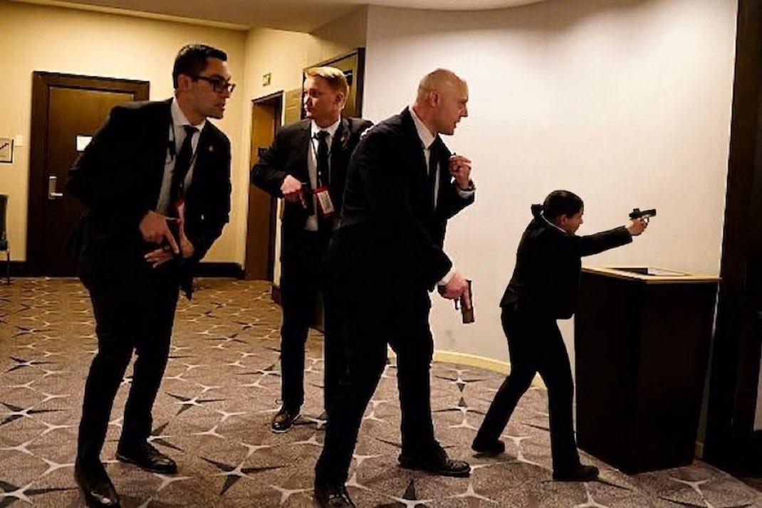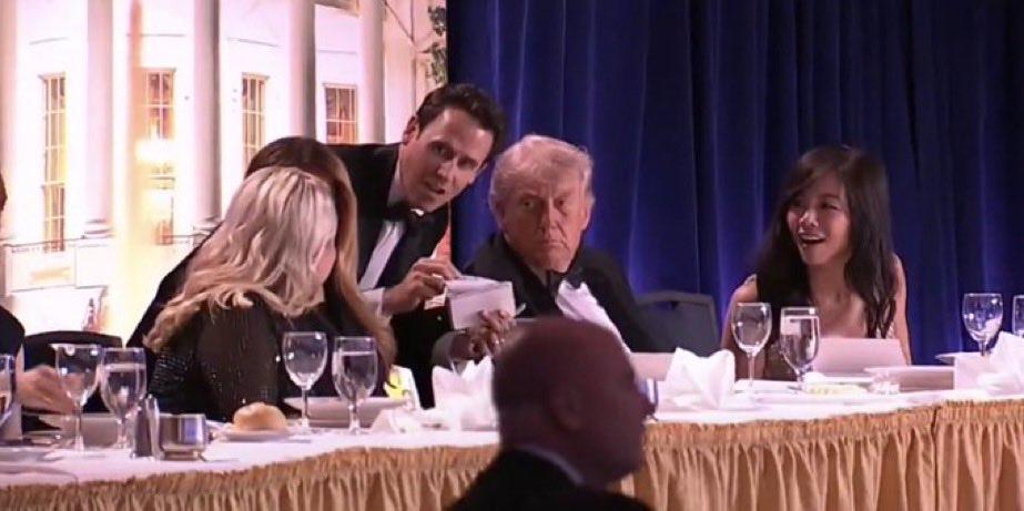特朗普在白宫官网说:“鉴于今晚事件,我请求所有美国人全心全意地重新致力于和平解决我们的分歧”。 难得的平和、理性、政治正确话,很少从他身上听到。 反复看了现场的很多视频和照片,总觉得哪儿哪儿不对劲,也说不上来。 如此重大安保事件出了纰漏,特朗普夫妇照样淡定,谈笑风生,确实大心脏。 特勤、保安在枪手出现后的表现,堪称完美。