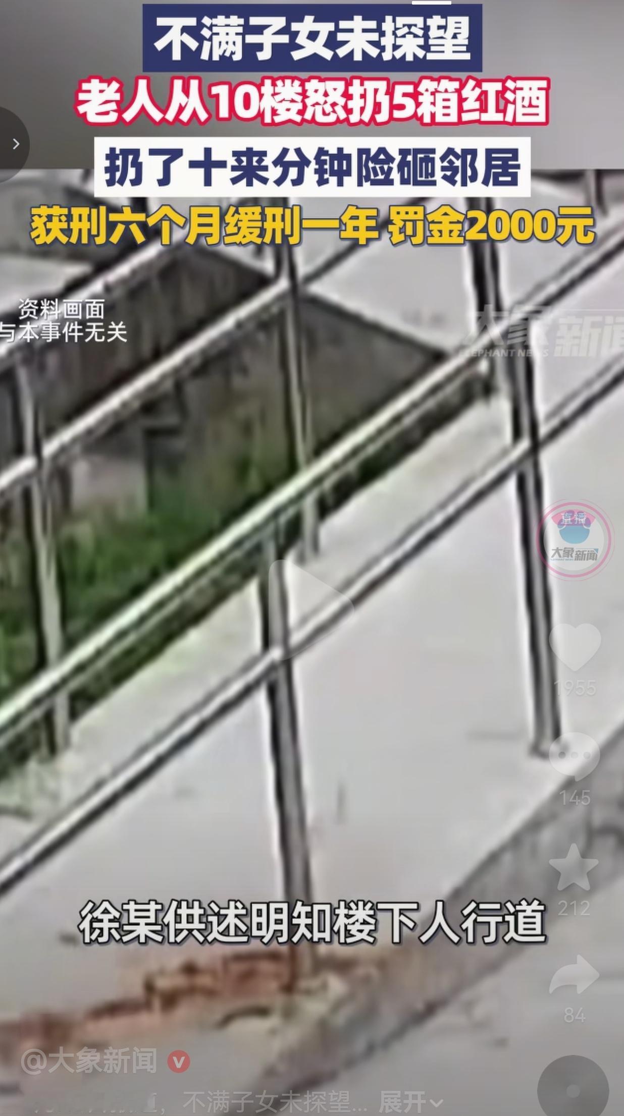 不满子女未探望,老人从10楼扔下5箱红酒泄愤,险砸路人被判刑 因为子女春节没回家,一位老人把气撒在了整栋楼的邻居身上。 这事发生在湖北竹溪,住在10楼的徐某,春节期间一直盼着子女回家,结果孩子没回来,他越想越气,直接把子女存在家里的5箱红酒,从阳台往下扔。 一扔就是十来分钟,红酒瓶砸在人行道上,碎渣四溅,楼下超市老板出门时险些被砸中,吓得魂都飞了。 徐某自己也承认,明知道楼下是居民必经的路,他还是一时情绪上头、明知故犯,把楼下路人、整栋邻居的安全,全当成自己泄愤的筹码。 万幸的是,这次没人受伤,但他的行为已经构成了高空抛物罪,最终被判处有期徒刑六个月,缓刑一年,还罚了2000块。 这事传到网上,网友们吵翻了: 有的网友说: 这也太离谱了吧?子女不回家你找子女啊,拿红酒砸路人算什么本事? 也有的网友说: 幸好没砸到人,不然就是几条人命!这要是真出事了,子女没探望,你自己先进监狱了! 还有的网友说: 真的,有些人的情绪失控,真的能可怕到不顾别人死活,自己不爽就要拉上所有人陪葬? 说实话,子女春节没回家探望父母,确实是他们的问题,可这跟楼下的邻居有半毛钱关系?他们招谁惹谁了?就因为你自己情绪上头,就要拿别人的命来买单? 高空抛物是什么概念?10楼扔下来的红酒瓶,砸到人身上就是致命的,这根本不是什么“老人不懂事”,是拿别人的命当儿戏。 更讽刺的是,这红酒还是子女存在他家里的,他一边抱怨孩子不回家,一边把孩子的东西扔下楼泄愤,到头来害的还是自己,还连累了一整栋楼的人。 很多人说,他只是一时糊涂,可我觉得,糊涂的背后,是极度的自私和任性。 你想发泄情绪,完全可以打电话跟子女吵,或者找社区调解,可你偏偏选了最危险、最不负责任的方式,把别人的生命当成自己情绪的垃圾桶。 这次没砸到人,只能说是邻居们命大,可下次呢?谁也赌不起。 这件事最让人后怕的,从来不是子女没回家,而是有些人,一旦情绪失控,连最基本的是非和敬畏都没了。 他们忘了,成年人的世界里,情绪从来不是伤害别人的理由,更不是违法犯罪的挡箭牌。 对家人的失望,不该变成对陌生人的恶意;自己的情绪,更不该凌驾在别人的生命之上。 最后,我想说的是:别拿别人的命,为你的任性买单。