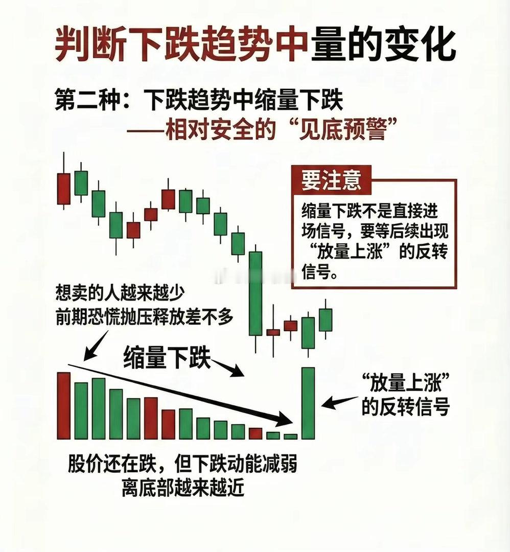口诀:放量下跌及时离场,缩量下跌观望等待;缩量并非见底信号,放量拉升才算企稳。