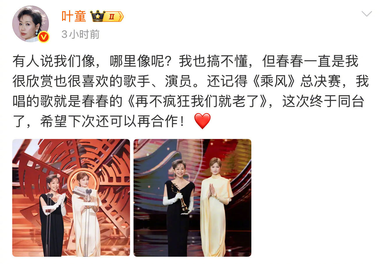 叶童晒与李宇春合照 叶童和李宇春一起担任北京电影节颁奖嘉宾,两个人台上萌萌互学就算了,下台竟然还有售后,彼此眼里全是对彼此的夸夸!