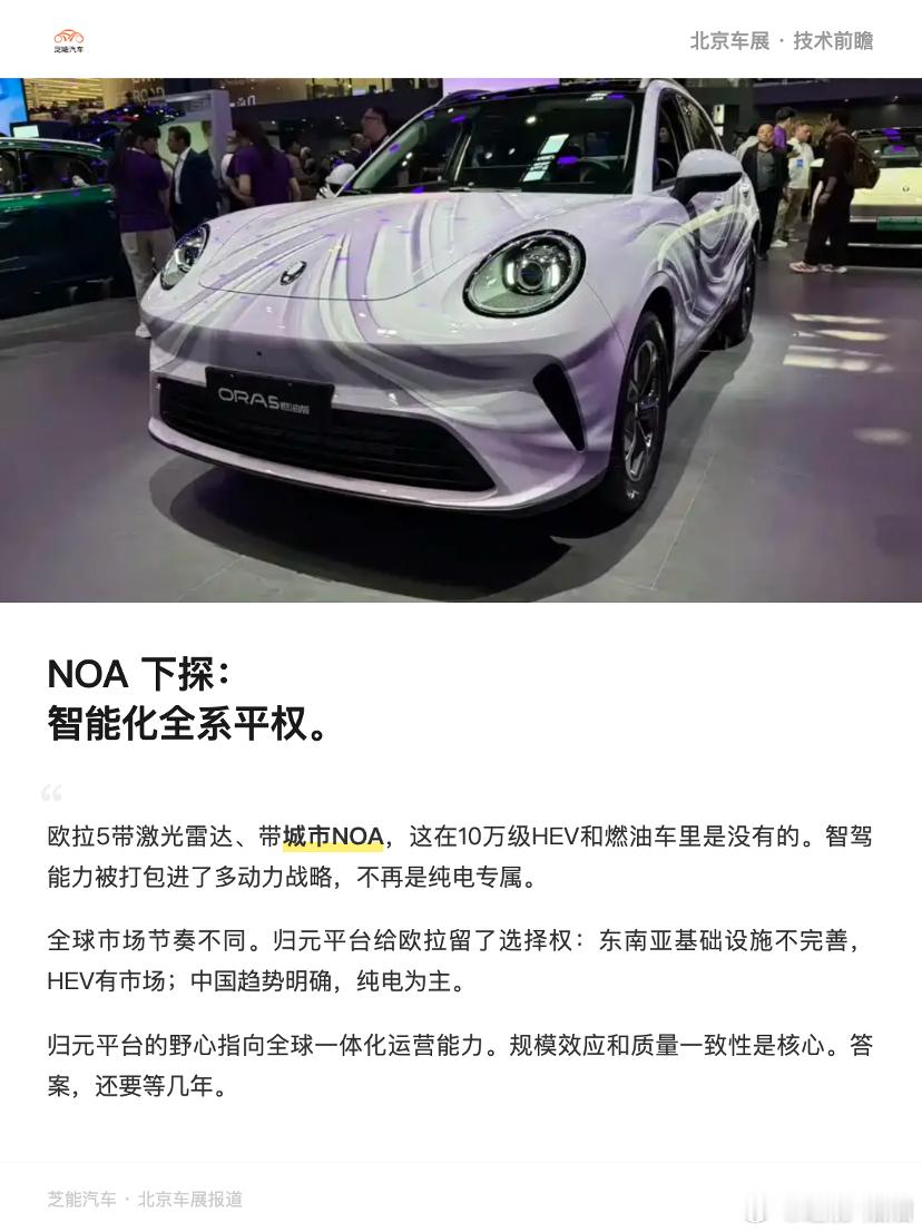 但区别在于规模和边界:• 星愿、MG4的单品逻辑:单款车打透,价格驱动,标签鲜明,短期内脉冲式销量上扬。• 欧拉的归元逻辑:平台先行,多动力、多品类、多市场并行,三到五年维度上算总账。吕文斌的回答很关键:"在国外,配件的及时率、可靠性,比什么宣传都重要。"当新能源渗透率突破50%,存量市场里的竞争已经从"能不能卖出去"变成"能不能持续地卖、持续地服务"。平台化带来的稳定性、一致性,是支撑这个目标的基础设施。两种打法,各有各的适用场景。单品爆款考验的是产品定义能力和供应链的执行效率;平台规模化考验的是体系能力和战略定力。长城选了后者。三)城市NOA下探和海外节奏采访中有一个细节值得关注:"欧拉5上市的时候是带激光雷达的,带城市NOA的,这是在这个级别里边没有的。"10万以下的混动车和燃油车,带城市NOA?带激光雷达?欧拉把智能辅助驾驶能力"打包"进了多动力战略里——不是纯电专属,而是多动力全系覆盖。吕文斌的原话:"但凡10万以下的应该都没有。所以欧拉,我们的燃油和我们的混动都能做到城市NOA,带激光雷达的城市NOA。"城市NOA的成本能否在10万级车型上实现?体验如何?这些都需要等到实车交付后验证,电动化和智能化的下探,不再是纯电的专属标签。欧拉5的海外节奏已经明确:• 泰国:3月已发布。• 巴西、欧洲:运车已经开始,上市时间各有安排。• 全球各市场、各动力形式:今年全部上市。长城欧拉5一开始就按照全球化标准开发。归元平台的"多动力"战略,恰好匹配了不同市场的基础设施成熟度差异• 中国:新能源趋势明确,纯电为主,混动作为补充。• 东南亚:充电基础设施尚不完善,混动有市场空间。• 欧洲、巴西:各有不同的动力偏好。