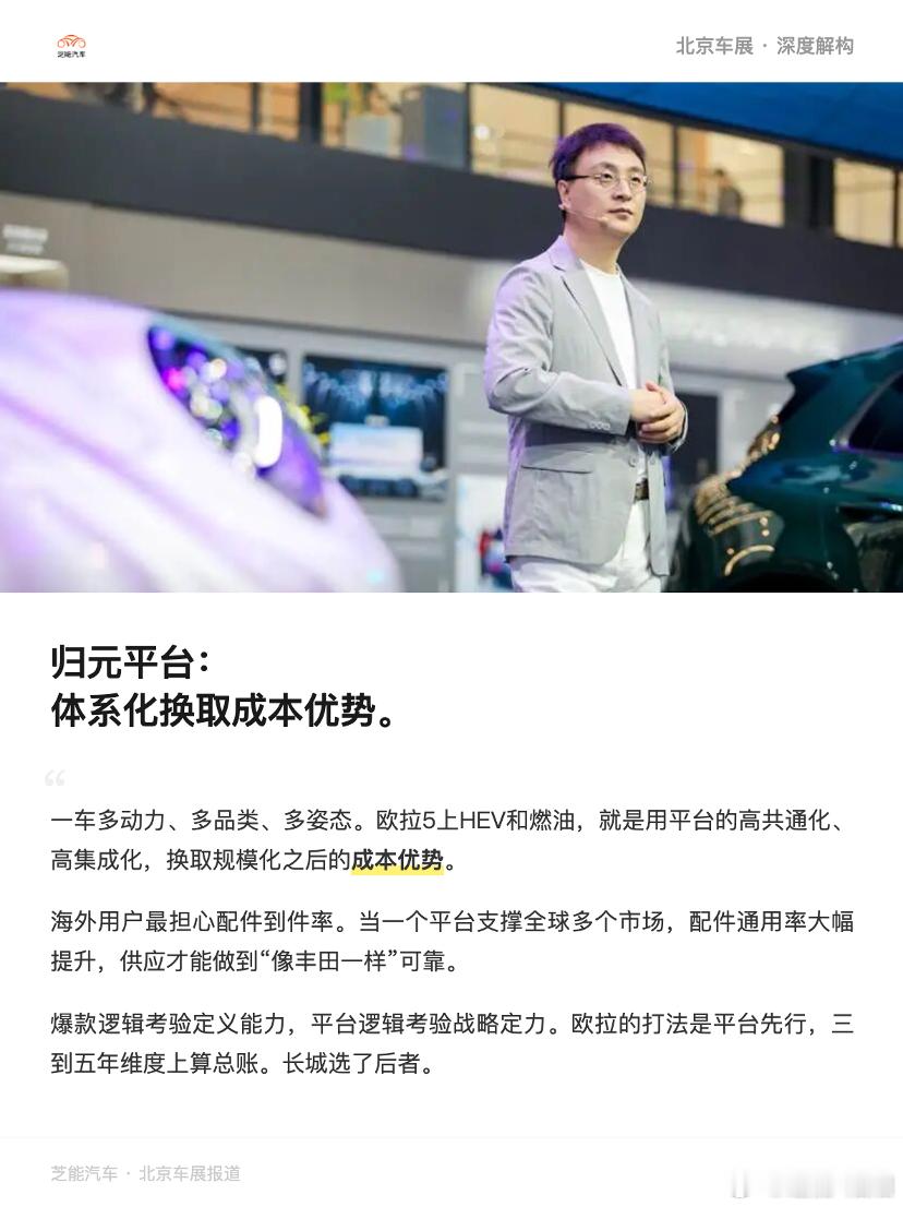 二)归元平台:长城的成本解法这场采访里,"归元"二字出现的频率极高,一车多动力、一车多品类、一车多姿态。具体怎么理解:• 一车多动力:同一个平台,支持纯电、混动、燃油等多种动力。欧拉5今天上了混动和燃油,纯电版去年12月已上市,后续同平台还会有更多动力形式。• 一车多品类:两厢、三厢、SUV,不同车身形式可以在同一个平台上生长出来。• 一车多姿态:普通版、运动版、时装车并行开发。这是用平台的高共通化、高集成化来换取规模化之后的成本优势。吕文斌不回避黑猫白猫时代"卖一辆亏一辆"的历史。那段经历让长城意识到:没有平台化支撑的精品小车,在成本上是不可持续的。归元平台是长城的供应链和工程体系的使用,单平台、多动力、多品类,意味着零部件的高度共享,采购成本的系统性下降,海外市场配件供应的及时性和可靠性可以真正做到"像丰田一样"。吕文斌提到了一个细节:海外用户最担心的是什么?是配件的到件率。丰田在全球市场建立信任,很大程度上靠的是配件体系的稳定性。归元平台解决的问题:当你一个平台支撑全球多个市场、多款产品,配件的通用率自然大幅提升。"吉利星愿、名爵MG4的打法是超高性价比驱动单款爆款,欧拉的打法是一平台多动力多品类,这两种经营逻辑有什么不一样?"吕文斌的回应坦诚:"理念是一样的,都是通过规模化来实现成本降低。"