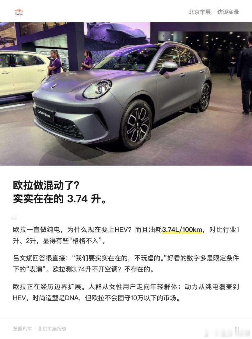 欧拉一直做纯电,为什么现在要上混动?而且油耗3.74L/100km,对比行业1升、2升,这个数字在当下的市场语境里,显得有些"格格不入"。两位受访人的回答很直接:"我们要实实在在的,不玩虚的。"1升、2升是怎么来的?一个技术层面的解释:按照正常道路工况的行驶阻力、按照发动机最佳效率去算,算出来的数字很好看,但那是理论值,是限定条件下的"表演"。“欧拉的3.74升是怎么测的?不开空调?不存在的。该加速加速,该踩刹车踩刹车。哪怕是做吉尼斯世界纪录挑战不会顺风,也不会做措施让油耗显得很低。"在行业普遍加"限定条件"的语境下,长城选择了一种更朴素的叙事方式。3.74升和2升之间的差距,用户感知上有多大?纯燃油用户在油价面前,这个数字有说服力。但对于混动竞品,这个数字的竞争力还需要市场验证。品牌层面,欧拉正在经历一次重要的边界扩展。最初欧拉的标签是清晰的:面向女性的精品纯电小车。好猫、芭蕾猫、白猫、黑猫,一水的圆润设计语言,目标人群高度聚焦。从欧拉5开始,这个边界开始发生改变。• 人群扩展:从女性用户,到整个年轻用户群体。• 动力扩展:从纯电,到混动、燃油,覆盖用户不同使用场景下的使用需求。• 市场扩展:从国内到泰国,再到巴西和欧洲。不变的是什么?时尚、有调性的造型设计,是欧拉的DNA。吕文斌说:"欧拉一定是以时尚为定位,像今天说的,我们是全球时尚精品汽车。"这个定位的边界在哪里?价格有没有上限?吕文斌的回答是:"这个不一定,后续还会有更加向上的产品。"欧拉不会固守10万左右的小车市场。归元平台上可以长出更大、配置更高的车型。而与哈弗的区隔,依然是人群和风格:欧拉是时尚精致,哈弗是大众经济型。欧拉的产品线不会走"推倒重来"的路线,而是在归元平台上做持续的生命周期延伸。老产品靠造型和口碑续命,新产品靠平台效率降低成本,两条腿走路。