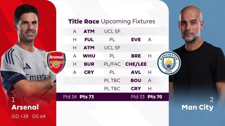 本赛季英超收官前,曼城和阿森纳在各项赛事都还有6场比赛。英超方面,曼城还剩5场比赛(3主2客),阿森纳还剩4场比赛(2主2客),两队都要对阵水晶宫,曼城的5个对手的英超排名普遍在上半区,阿森纳的剩余对手的英超排名则普遍在下半区。