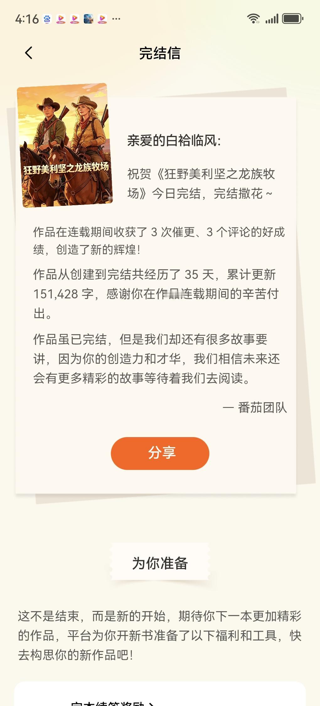 小说今日完结,不得不承认,这是扑街了。下一部长篇暂时是不想写了,写一些短故事试试吧。之前写的二十多篇短故事,阅读量就没有过百的,真是令人无语。平台根本不给推荐,作为新人作者又能有什么办法呢?
