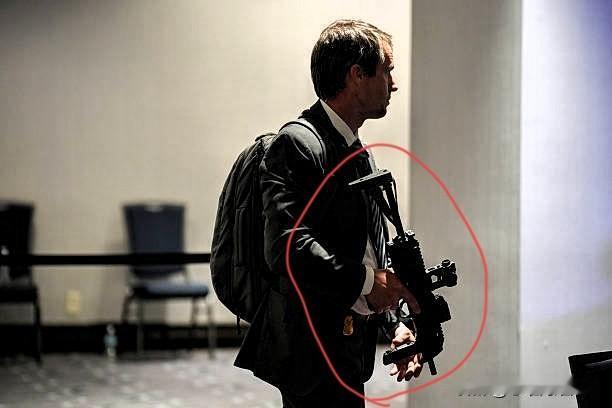白宫晚宴枪击案,手持经典MP7A1冲锋枪的特勤局内卫(FBI),出现在希尔顿酒店案发现场。 身着灰色西装,背着EXP战术背包。 手持一把安装有T2红点瞄准镜的MP7A1经典冲锋枪。 而仔细看了看,为了方便隐蔽携带,这把MP7A1冲锋枪,居然改上了一把短弹匣了。