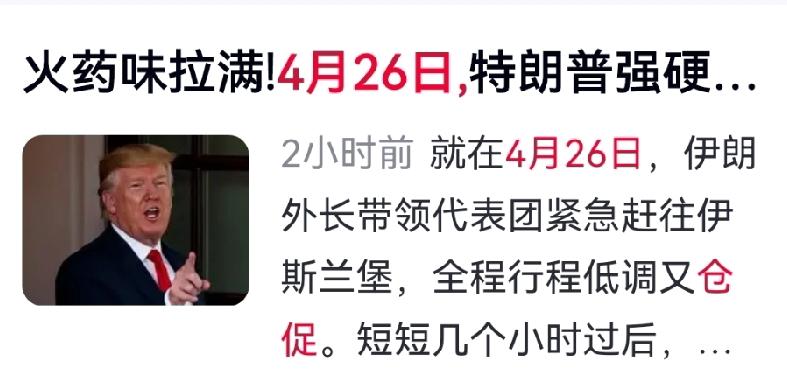 突发!美伊谈判彻底谈崩,没开始就结束,中东局势骤紧 4月26日,巴基斯坦传来重磅消息,美伊第二轮谈判直接破裂,尚未正式启动便仓促收场。 伊朗外长提前离开伊斯兰堡,启程出访阿曼、俄罗斯,随行人员全部返程回国,彻底放弃本次会晤。 美方原本敲定特使紧急奔赴巴基斯坦磋商,结果谈判对象先行离场,特朗普紧急叫停出访计划,双方博弈全面暂停。 本轮谈判破裂核心,在于伊朗态度全面强硬,不再妥协退让,坚持以自身诉求为核心永久止战。 历经多轮博弈与冲突,伊朗全民凝聚力大增,摸清美军短板,底气十足。 反观美国,深陷中东消耗泥潭,巨额军费持续透支国力,战略误判凸显,全球霸权影响力持续下滑。 战和两难进退维谷,盟友关系出现裂痕,中东格局迎来大变局,后续走向值得高度警惕。 对此,你怎么看? 美伊谈判破裂 中东局势