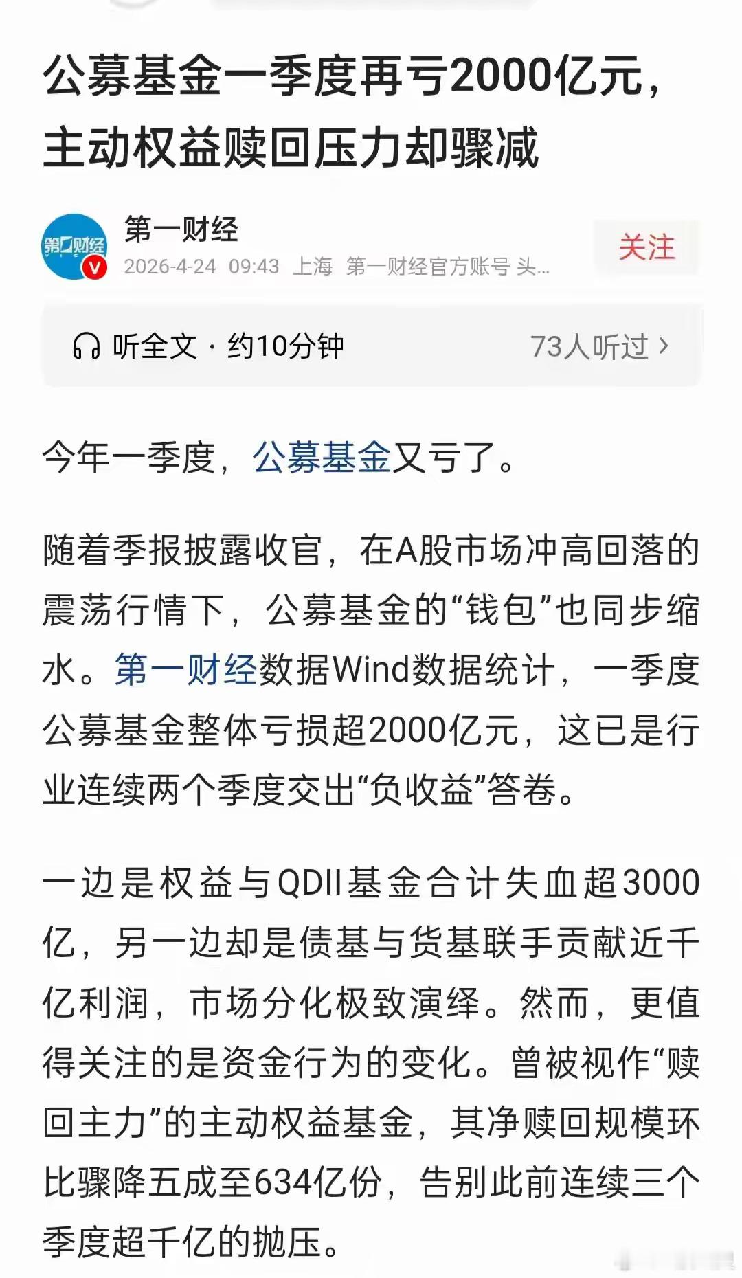 a股投资 公募基金一季度亏2000亿,怎么亏的,加仓很多高位股,也是掩护部分机构出货而接的盘,有人卖,有人买,公募基金用基民的钱为前面的机构接盘。公募基金亏成这样,不是蠢就是坏,蠢的是买高位股,已经高估了的可能会面临长期下跌。坏的是老鼠仓,利益交换,高位接盘吃回扣的老套路,这种情况下基金公司就是亏百分之八九十,也不影响它们收管理费,基金经理工资奖金照发。庄家私下给它们分成,亏的钱是基民的钱。——这两年行情,大盘从2700点到4000点,很多股票已经透支了高估了,很多基金也一样,不值得买。不要随意听别人忽悠随便买基金!