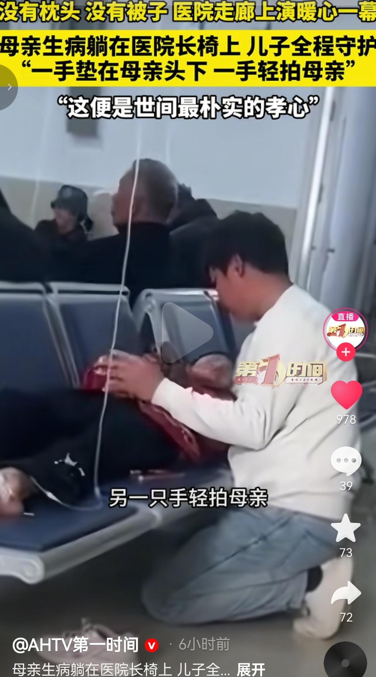 医院走廊这一跪,看哭了无数人:孝顺,从来不是嘴上说说 江苏连云港一家医院的走廊里,没床,没枕头,啥都没有。一个高高大大的男人,就这么直愣愣跪在冰凉刺骨的地板上,把自己的手,死死垫在生病妈妈的头底下,当了回人肉枕头。 妈妈住院输液,折腾了大半天,身子早就扛不住了,实在没办法,只能在走廊的硬长椅上躺会儿歇一歇。 那椅子又硬又冰,硌得慌,连个能枕脑袋的东西都没有,怎么躺都难受,根本睡不着。 儿子看在眼里,心都揪疼了。啥废话都没说,扑通一声就跪了下去,一只手稳稳垫在妈妈头下,另一只手轻轻拍着妈妈的背,就跟哄刚出生的小娃娃一样,慢慢哄着她入睡。 就这么一直跪着,膝盖跪得发麻发僵,腿都快没知觉了,他愣是一动不动。生怕自己稍微挪一下、动一下,就把好不容易睡着的妈妈给吵醒了。 这一幕,被路过的人随手拍了下来,一下子就戳中了无数人的心窝子,看哭了一大片人。 有的网友说:“瞬间破防!我妈住院的时候我也这样,真的,恨不得替她挨所有的疼、遭所有的罪!” 也有的网友说:“这哪是一只手啊,这分明是当儿子的一片真心!看得我鼻子直发酸,眼泪打转!” 还有的网友说:“说真的,现在能做到这份上的年轻人,真没几个了,这才是实打实的孝顺,不是嘴上瞎念叨!” 更有网友表示:“我爸走之前,我都没好好陪在身边,看着这视频,眼泪压根止不住,太后悔了……” 说实话,看到这一幕,我心里又暖又堵得慌,特别不是滋味。 暖的是,这年头大家都忙着赚钱,人情越来越淡,可还有这样实打实、不掺一点假的孝心。不玩虚的,不搞那些花里胡哨的,就用自己的身子,给妈妈当最踏实的依靠,这才是最真的感情! 可心里也堵得难受!我们天天把孝顺挂在嘴边,总觉得给父母点钱、买两件衣服、捎点补品,就算是尽孝了。可我们从来没好好想过,父母真正想要的,根本不是这些啊! 他们老了,病了,身子不如从前了,就跟小孩子一样脆弱,要的从来不是多少钱、多贵的东西,就是你能多陪一会儿,多一点耐心,多在身边守着他们!别等到人没了,才想起来后悔,那时候啥都晚了! 医院这个地方,从来都是照见人性的镜子,谁真心实意对你好,谁只是嘴上应付,在这儿一眼就能看明白,装都装不出来。 这辈子,我们欠父母的,怎么还都还不清。他们拼了一辈子的力气,把我们一把屎一把尿拉扯大,等我们终于长大成人了,他们却老了、病了,脆弱得不堪一击。 这时候,他们要的不是大富大贵,不是豪言壮语,就只是一句简单的“妈,别怕,有我在呢”! 这个儿子下跪的姿势,一点都不好看,甚至显得有些狼狈,可在我心里,这比任何光鲜亮丽的姿态都高贵!他跪着的,是生他养他、倾尽所有的妈妈,他托起来的,是整个家的温度和依靠! 这世上最动人的东西,从来都不是什么惊天动地的誓言,也不是什么贵重的礼物。而是你最脆弱、最无助的时候,有人愿意拼尽全力护着你,哪怕放下所有体面,哪怕一直跪着,也要给你一份安稳,让你能踏实歇一会儿。 最后,我想说的是:父母在,家就在;别让孝顺,只停留在嘴上!