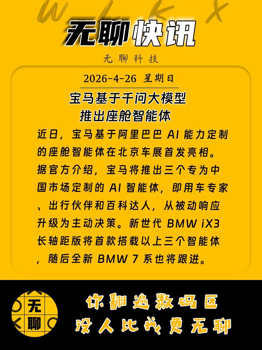 【宝马基于千问大模型推出座舱智能体】近日,宝马基于阿里巴巴 AI 能力定制的座舱智能体在北京车展首发亮相。据官方介绍,宝马将推出三个专为中国市场定制的 AI 智能体,即用车专家、出行伙伴和百科达人,从被动响应升级为主动决策。新世代 BMW iX3 长轴距版将首款搭载以上三个智能体,随后全新 BMW 7 系也将跟进。超感智能座舱未来将应用到宝马所有车型 有点东西