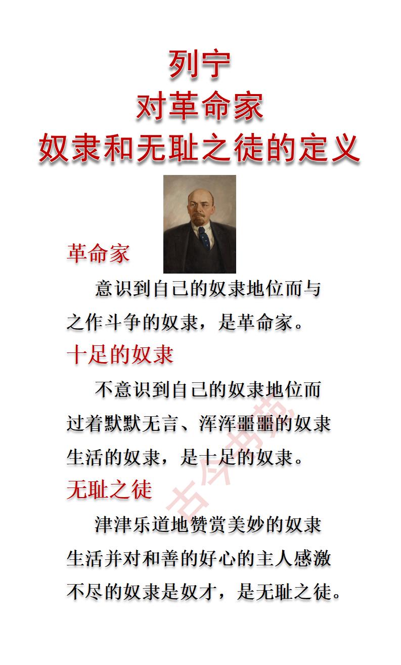 列宁对革命家、十足的奴隶和无耻之徒的定义 伟人之所以被称为伟人,是因为他们讲的话能直击灵魂,他们做的事能惠及众人。 接下来一起欣赏一下,世界公认的无产阶级革命家的伟大导师和精神领袖说的话。 他认为: 意识到自己的奴隶地位而与之作斗争的奴隶,是革命家。 不意识到自己的奴隶地位,而过着默默无言、浑浑噩噩奴隶生活的奴隶,是十足的奴隶。 津津乐道的赞赏美妙的奴隶生活,并对和善的好心的主人感激不尽的奴隶是奴才,是无耻之徒。 看完这段话,令人深思! 虽然,现在我国已经没有奴隶,但是有着奴隶思想的人,不在少数。 自己和自己斗争。 你能战胜懒惰的自己? 你能做到几成的自律? 你在刷手机的时候,是在学习,还是在娱乐,还是成瘾? 现在的低头族、手机控何时能够摆脱? 一个人最大的敌人,不是别人,而是自己,当你摆脱游戏、手机、懒惰时,你的生活将会彻底的改变。 不要做自己的奴隶,要做就做自己的主人,懂得做斗争,学会自律自控自强。