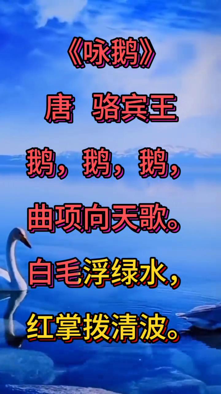 《咏鹅》 唐,骆宾王。 鹅,鹅,鹅,曲项向天歌。 白毛浮绿水,红掌拨清波。 这首诗以儿童的视角观察白鹅戏水,寥寥数语就勾勒出一幅色彩明丽、动静相宜的画面。 前两句鹅,鹅,鹅,曲项向天歌。通过连续呼告和曲项向天歌的细节,生动再现了鹅鸣叫时昂首向天的姿态,仿佛能听到其响亮的叫声。 后两句白毛浮绿水,红掌拨清波,则巧妙运用白、绿、红三种颜色的对比,描绘出白鹅浮游于碧波之上,红掌波动清波的悠闲场景。 与波两个动词精准传神,让画面镜中有动,充满生机。 全诗语言质朴自然,节奏轻快,既体现了孩童对事物的敏锐观察和天真情感,也展现了诗人早年以显露的诗歌才华。