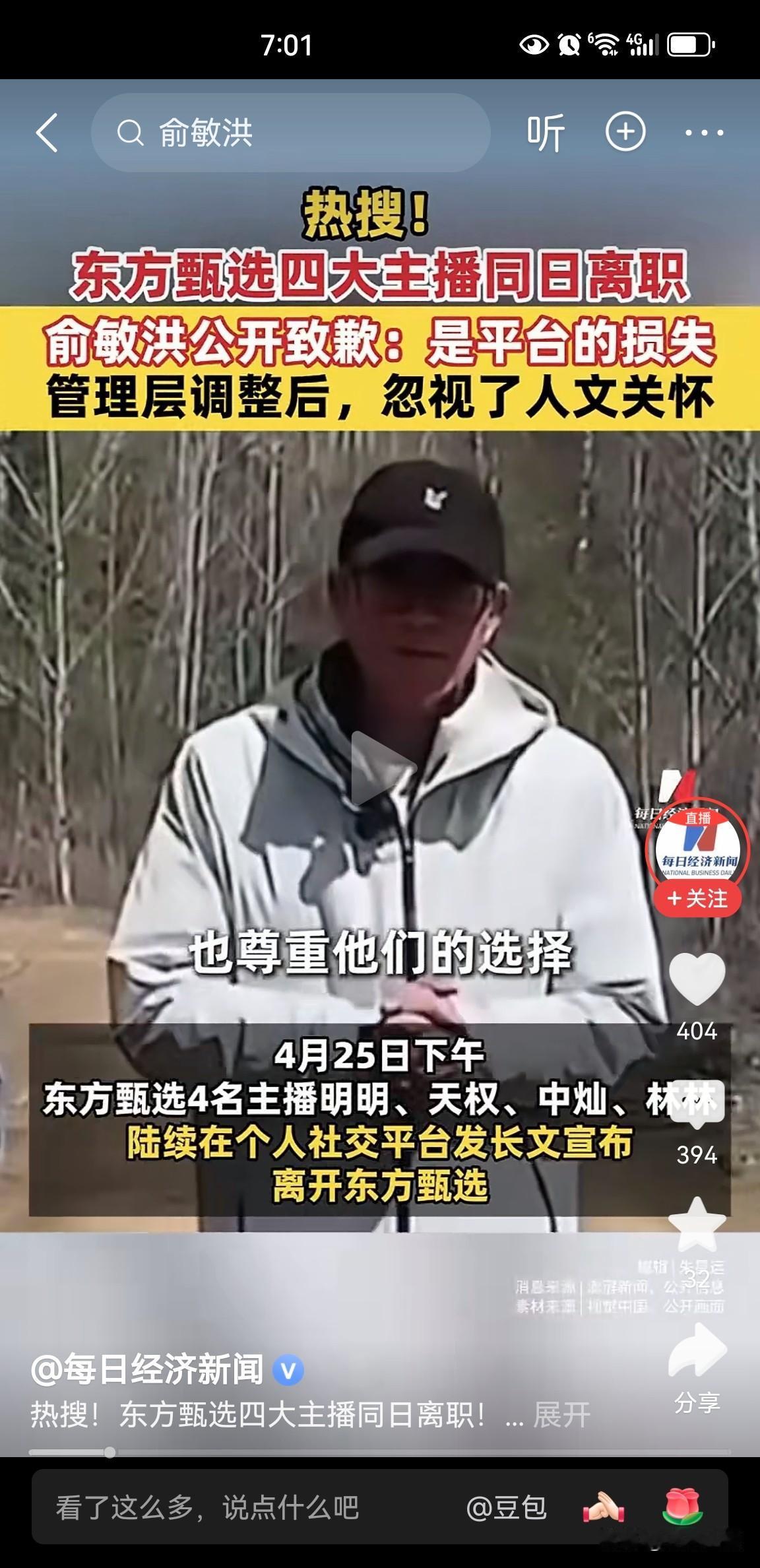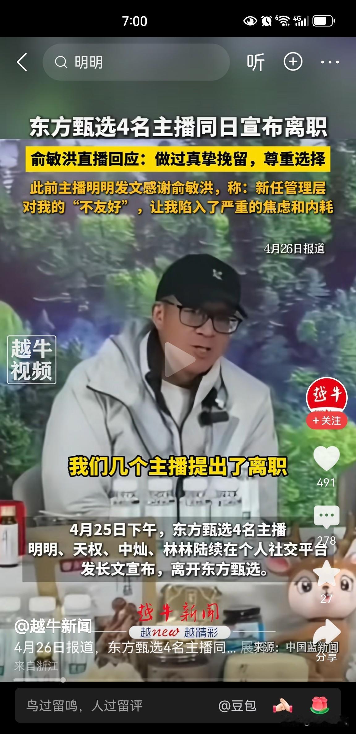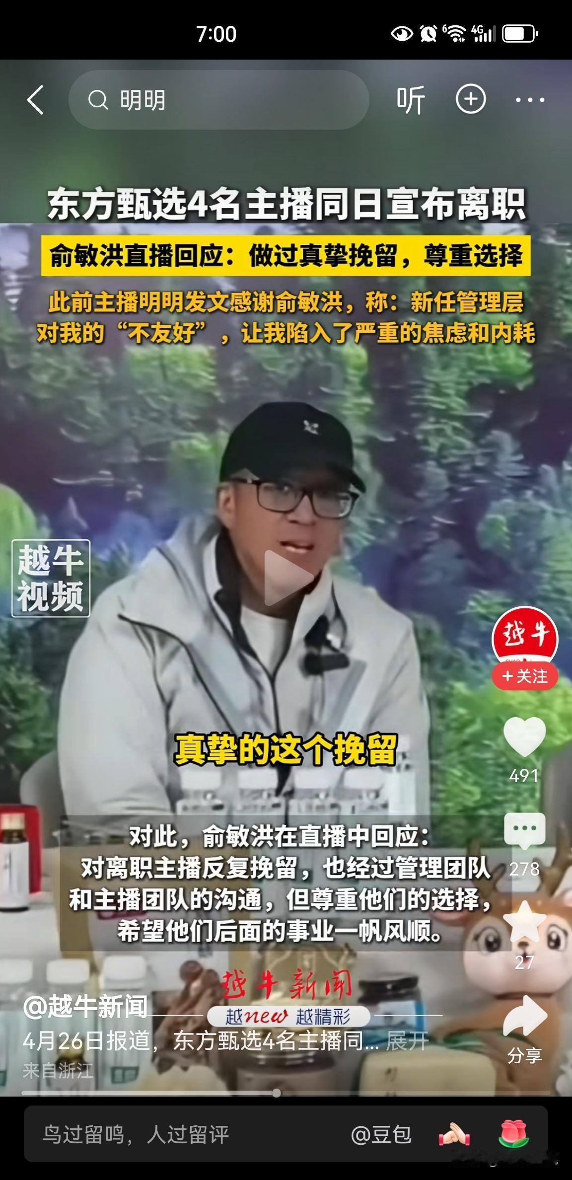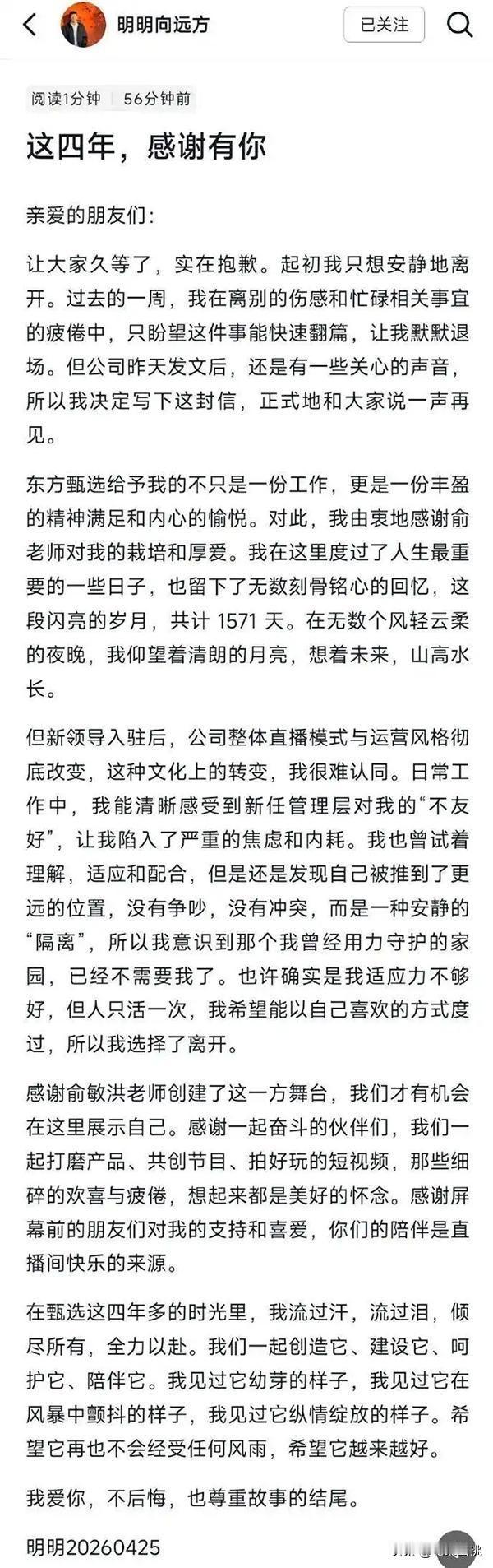 东方甄选4名主播(明明、天权、中灿、林林)同日离职!明明曾发文感谢俞敏洪称:新任管理层对我的“不友好”,让我陷入严重的焦虑和内耗…… 俞敏洪公开致歉:4名主播的离开是平台的损失,管理层调整后,忽视了人文关怀,对离开主播做过真挚挽留,但尊重他们的选择,希望他们后面的事业一帆风顺。 看了4名主播离开的感言,他们都提到了公司更换了管理层,理念变了、直播模式与运营风格都发生了彻底的改变。 他们都曾努力去适应新的管理模式,但几个月下来发现还是很难适应,因此,有人产生焦虑、内耗;有人被推到了更远的位置;有人找不到自己继续留下来的理由。 最终,4名主播怀着遗憾和不舍选择离开。 好多网友留言说,好怀念曾经“F4”的东方甄选,董宇辉、顿顿、明明和天权的直播组合,如今真的都散了。 说真的,分分合合在名利场太正常了,古语讲“合久必分、分久必合”,没有谁能一直待在原地。 新人不可能一直是新人、旧人也不会永远停在原地、制度也在不断改进来迎合新的市场,走的走了,来的来了,但东方甄选还将继续。 愿他们都能找到新的更适合自己的舞台。