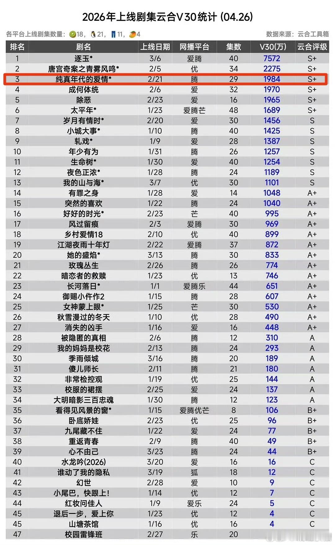 陈飞宇孙千《纯真年代的爱情》是目前为止2026腾讯独播第一!!