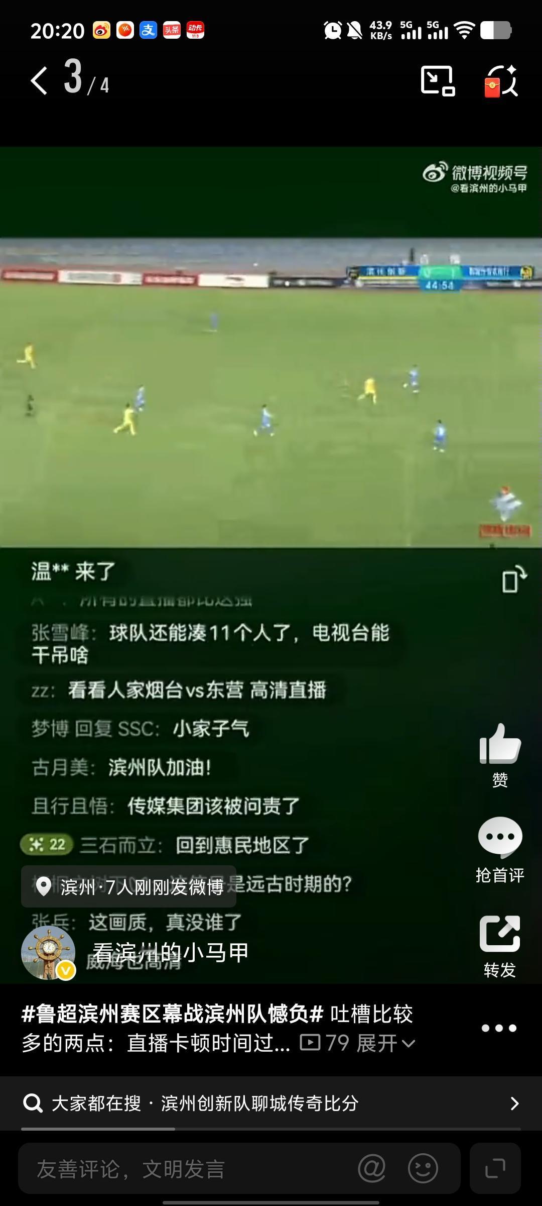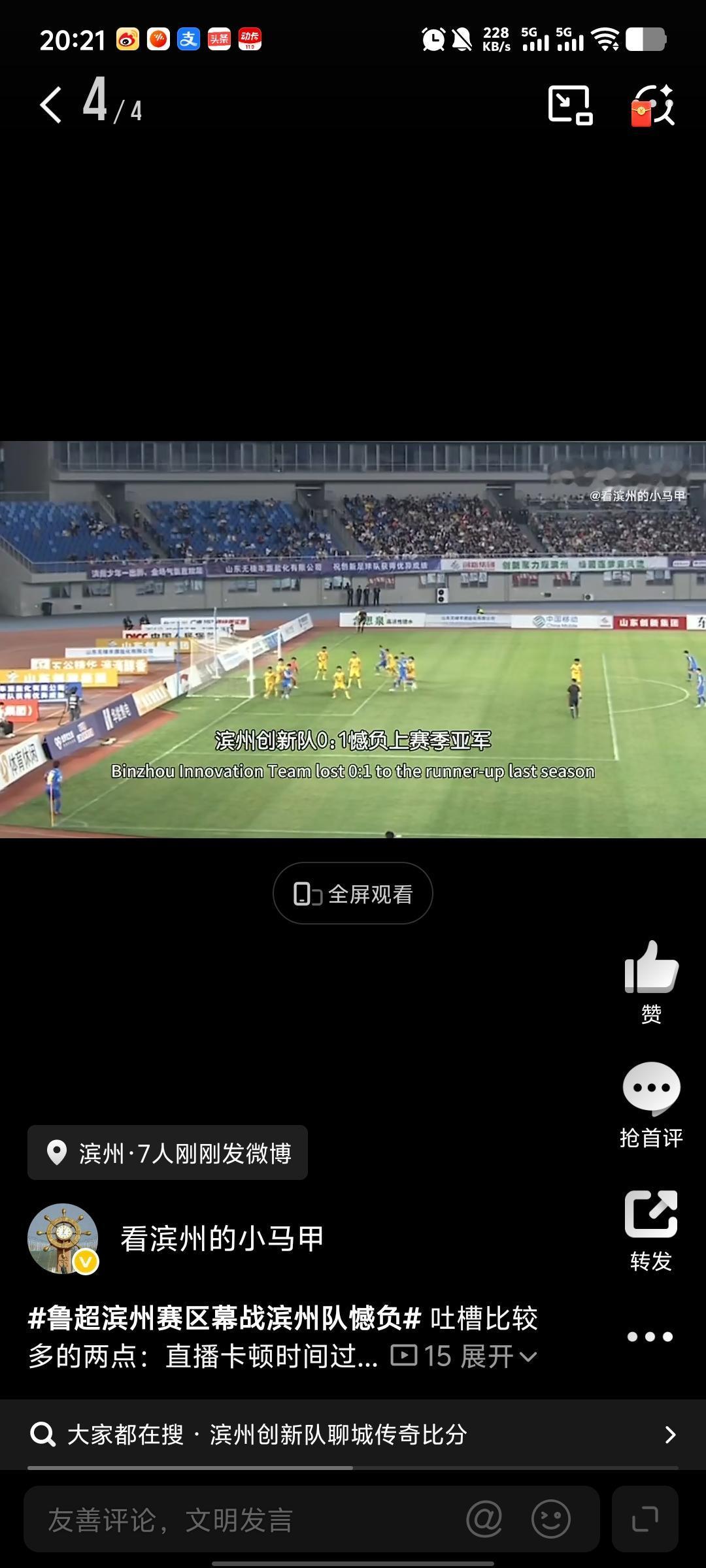 鲁超滨州赛区幕战滨州队憾负 2026年4月25日 19:30,2026 年“鲁超”滨州赛区揭幕战在滨州市全民健康文化中心体育场打响,主场滨州创新队 0:1 憾负上赛季亚军聊城传奇农商行队。 除了胜负的结果,吐槽比较多的还有两点:直播卡顿时间过长、体育场座位满是灰尘。