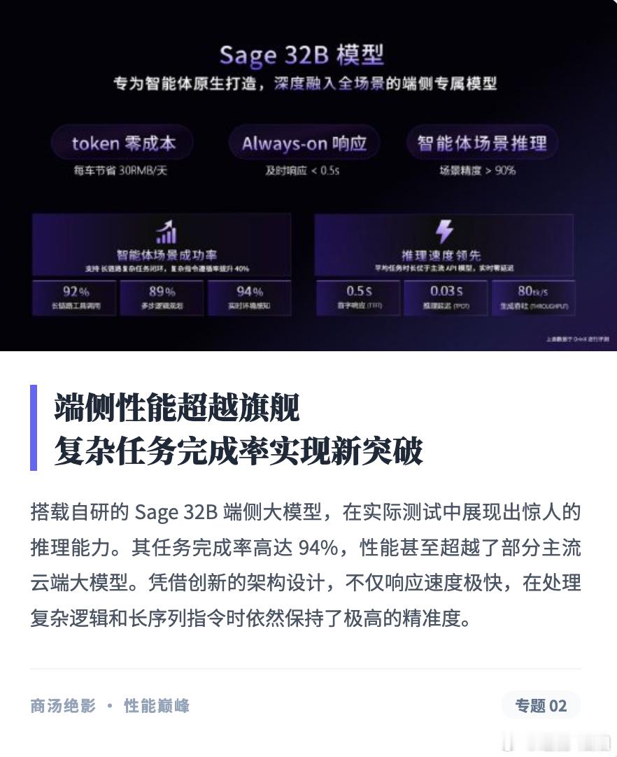 在技术架构上,Sage Box采用“三层体系”:端侧大模型Sage 32B、系统中枢Sage AIOS,以及执行层智能体New Member。Sage 32B基于MoE架构,总参数32B,但激活参数仅3B,可在英伟达Orin X等主流车规平台运行,实现较高效率与性能平衡。其在多项任务测试中实现超过90%的场景推理精度,具备处理复杂指令与多任务协同的能力。