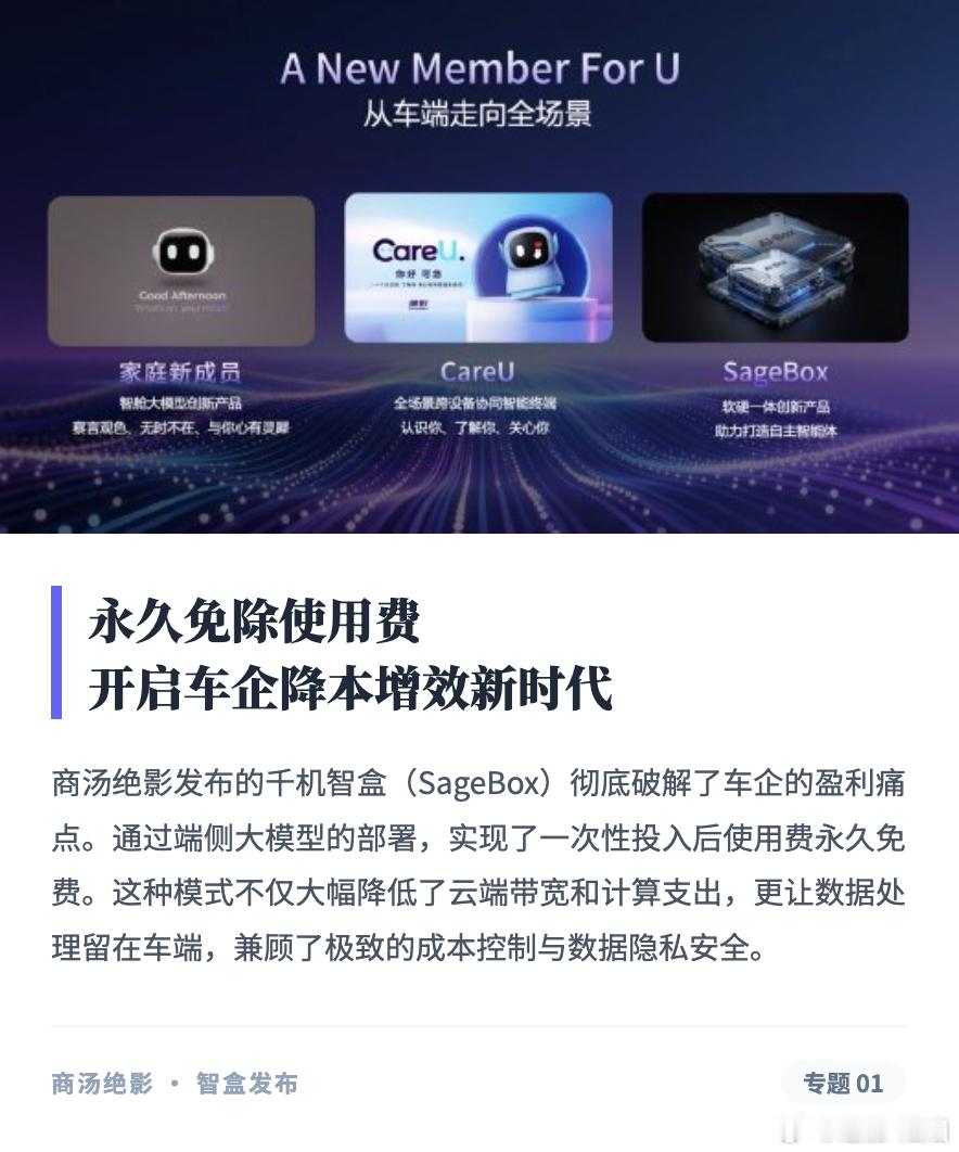 在2026年北京车展期间,商汤绝影正式发布全新车载智能解决方案——Sage Box(千机智盒),以端侧大模型与软硬一体架构,推动智能座舱向“自主智能体”阶段演进。