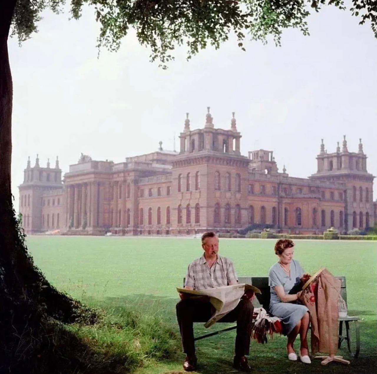 【来自投稿】第十代马尔伯勒公爵约翰·斯宾塞-邱吉尔和公爵夫人亚历山德拉(现任公爵的祖父母)在祖宅布伦海姆宫附近的草地度过悠闲的下午时光,1957年。