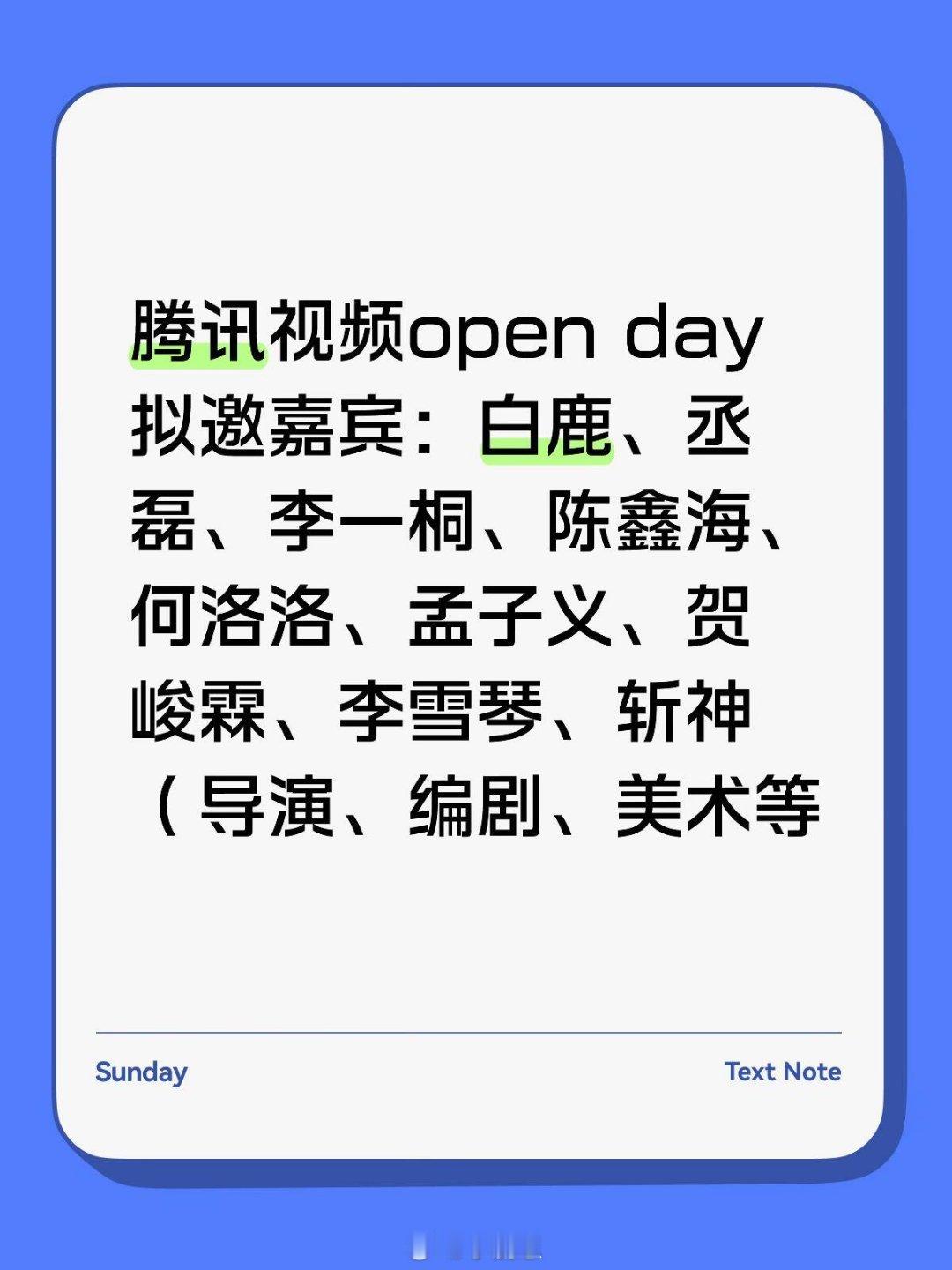 腾讯视频open day拟邀嘉宾:白鹿、丞磊、李一桐、陈鑫海、何洛洛、孟子义、贺峻霖、李雪琴、斩神(导演、编剧、美术等