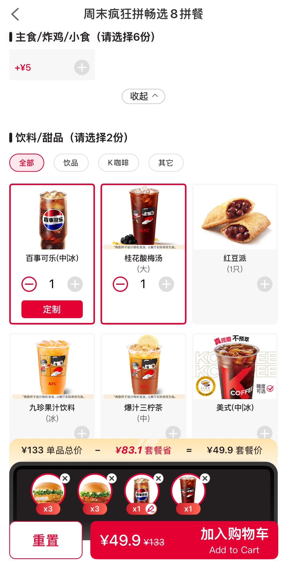 今天发现,连肯德基这种高级快餐,都已经开始打骨折促销了。 今天买了个周末套餐,五个汉堡加两杯饮料,49.9,这在以前简直是不可能的。 麦当劳被收购之后,麦当劳的套餐价格就明显下降了,但肯德基没有明显跟进,它比麦当劳稍微贵一点。 现在看来,肯德基也熬不住了。 之所以说肯德基高级,不是说他食物高级,而是他在麦当劳降价之后,还在挺,现在终于挺不住了 肯德基划算套餐 肯德基美食季