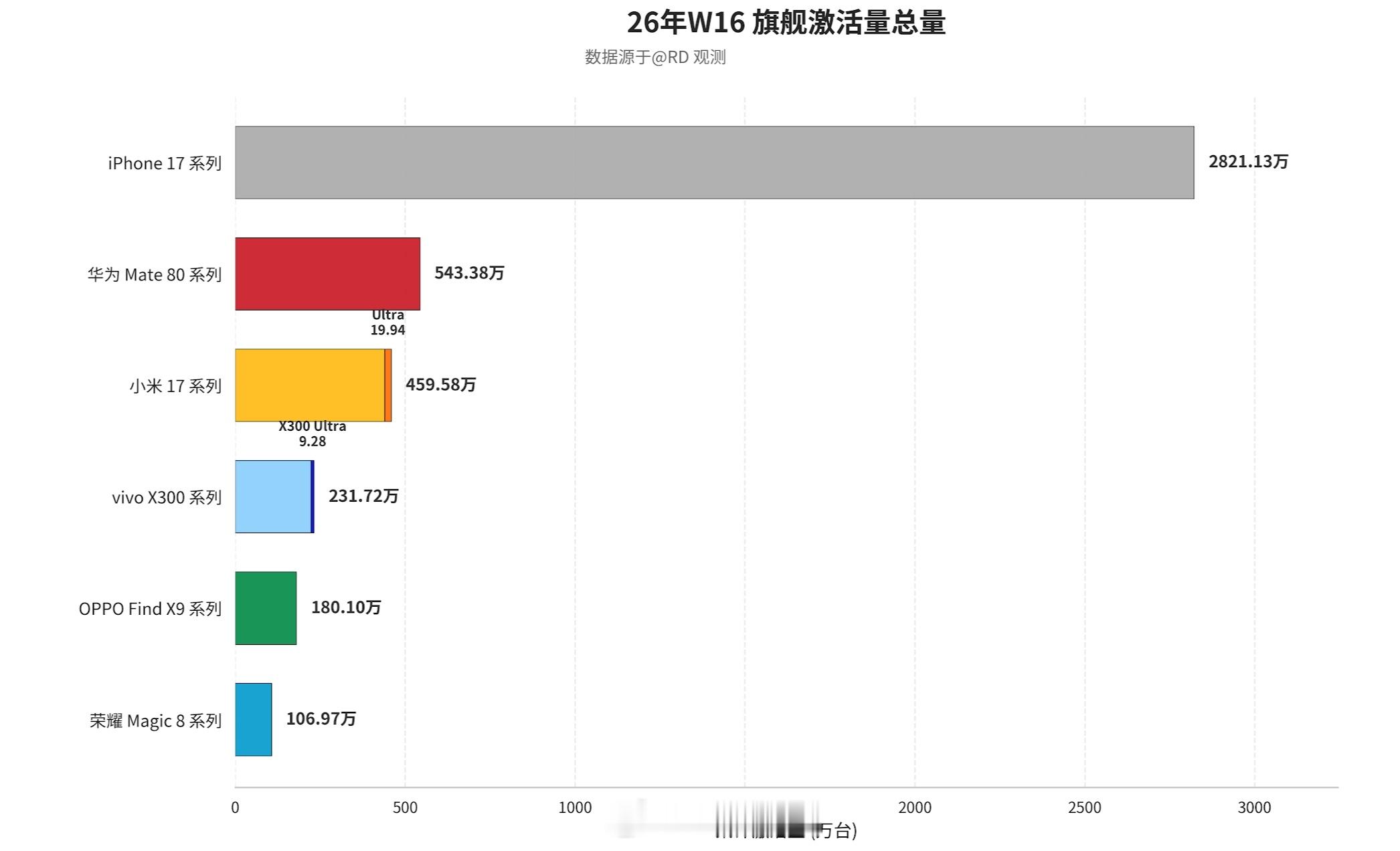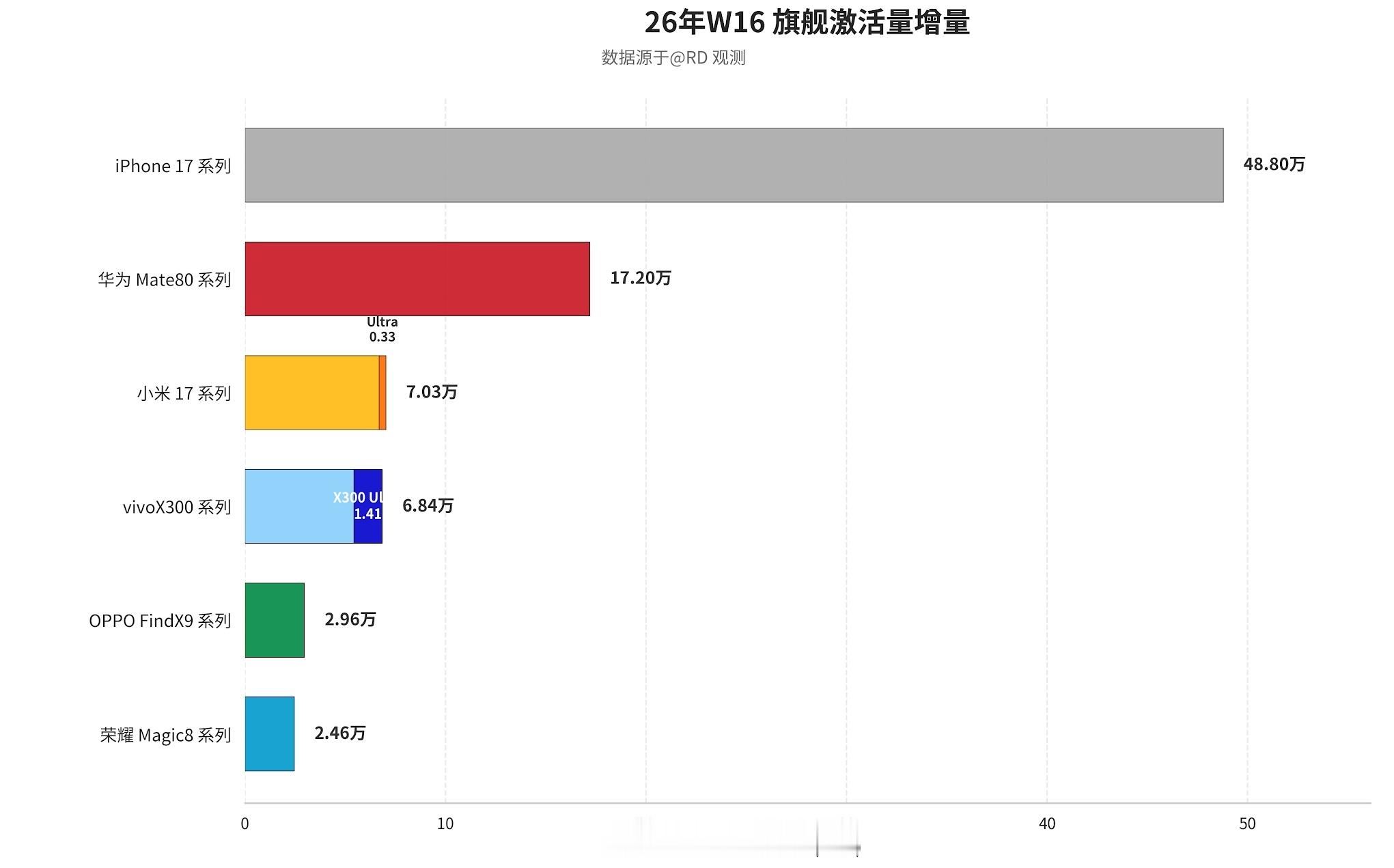 W16旗舰激活量增量iPhone 17 系列 48.8 万华为 Mate80 系列 17.2 万小米 17 系列 7.03 万台(含 Ultra 0.33万)vivoX300 系列 6.84 万(含 X300 Ultra1.41 万)OPPO FindX9 系列 2.96万荣耀 Magic8 系列 2.46 万