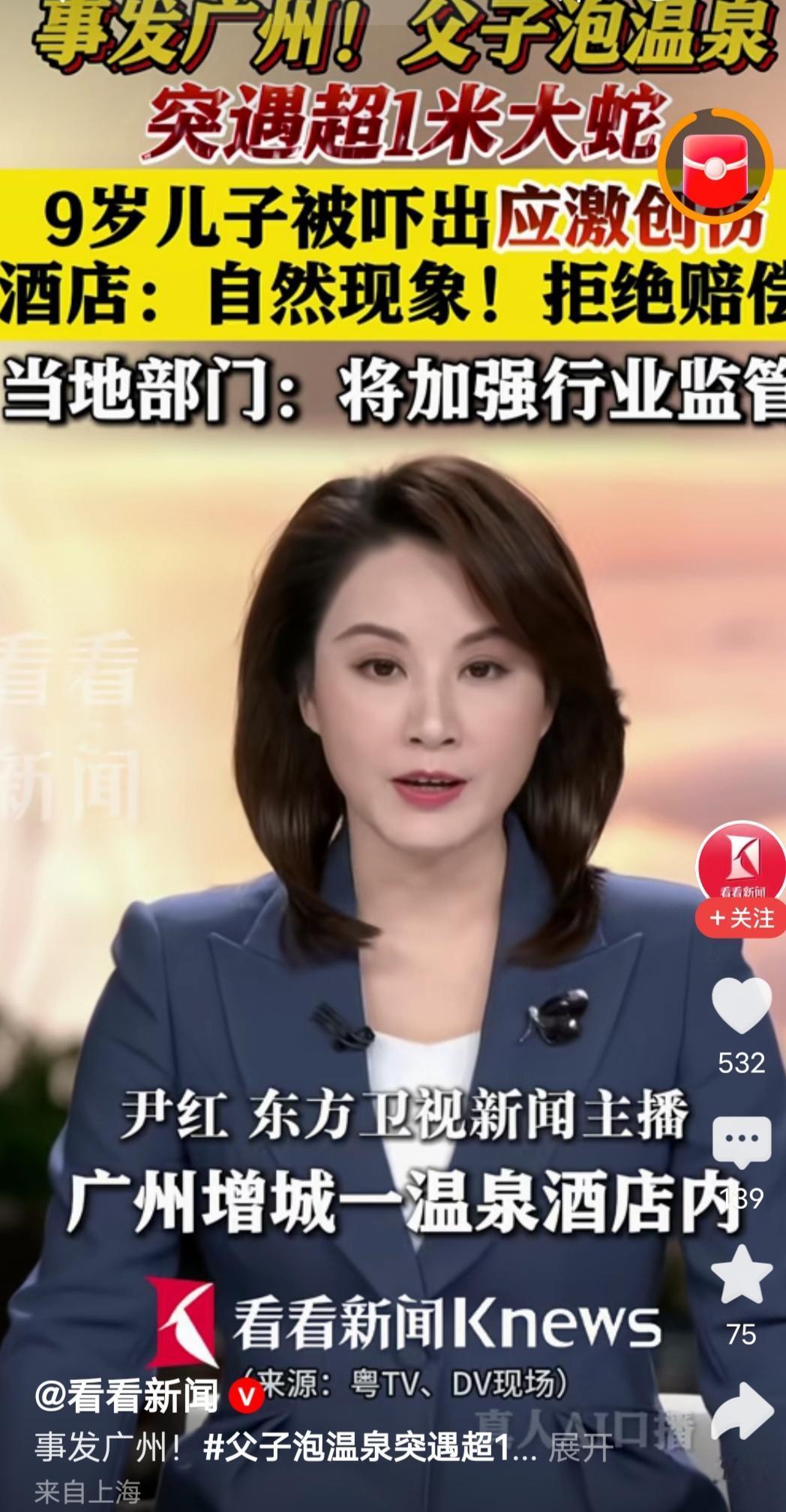事发广州!父子泡温泉突遇超1米大蛇,9岁儿子被吓出应激创伤,酒店:自然现象!拒绝赔偿,当地部门:将加强行业监管。 谁能想到,带着孩子开开心心去泡个温泉,能撞见这么吓人的场面?换谁都得心里发怵。那可是个才9岁的小孩,正安安稳稳泡在池子里,突然窜出来一条一米多长的大蛇,那冲击力,比看十部恐怖片还管用。事后孩子直接被吓出了应激创伤,连睡觉都得开着灯,一闭眼就是蛇的影子,连大人看着都心疼。 可更让人火大的是酒店的态度,轻飘飘一句“自然现象”,就把责任推得一干二净。合着客人花钱来你这儿消费,连最基本的安全保障都换不来?温泉池是你酒店经营的场所,不是荒郊野外,客人进来泡汤,默认的前提就是这里是安全的,没有野生动物闯进来的风险。酒店明明有义务做好防护措施,比如安装防护网、定期排查隐患,结果啥也没做到,出事了就拿“自然现象”当挡箭牌,这不是推卸责任是什么? 其实这种事真不是个例,之前也听过不少酒店、民宿出现安全问题,最后都拿“不可抗力”“自然因素”搪塞过去。可说白了,很多时候根本不是什么不可抗的意外,就是酒店的安全管理没跟上。像这种温泉池,周围有没有做好防蛇的围挡?有没有定期请人做过驱蛇处理?夜间或者非营业时间有没有排查过池子里的情况?这些都是酒店本该做的分内事,没做到就是失职。 孩子被吓成那样,心理上的伤害可能比身体上的更难恢复。酒店连最基本的道歉和安抚都没有,反而拒绝赔偿,这样的处理方式,换哪个家长能接受?这次如果就这么不了了之,那下次还会有别的客人遇到同样的问题,酒店也不会真正重视安全隐患。当地部门说要加强行业监管,可监管不是嘴上说说,得落到实处才行,得让这些商家知道,客人的安全不是一句轻飘飘的“自然现象”就能打发的。 很多人出去玩,都觉得选个看起来正规的酒店就万事大吉了,可没想到风险就藏在这些细节里。我们花钱买的不只是服务,更是安心。希望这次的事能给所有商家敲个警钟,别再拿客人的安全当儿戏,也别再用这种敷衍的借口推卸责任。毕竟,谁也不想在花钱放松的时候,遭遇这样的惊魂一刻。 各位读者你们怎么看?欢迎在评论区讨论。