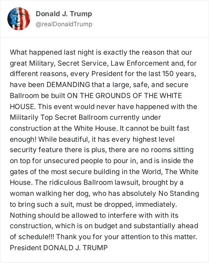 川普:昨晚的枪击事件, 再次证明了修建宴会厅的无比正确! 如果建好了,根本就不会发生枪击案。 近期一名遛狗女子提起荒谬的诉讼, 耽误了宴会厅的建设速度, 她完全没有资格提起这样的诉讼, 必须立即撤销。 必须加快建设这个大型、 可靠、安全的宴会厅!