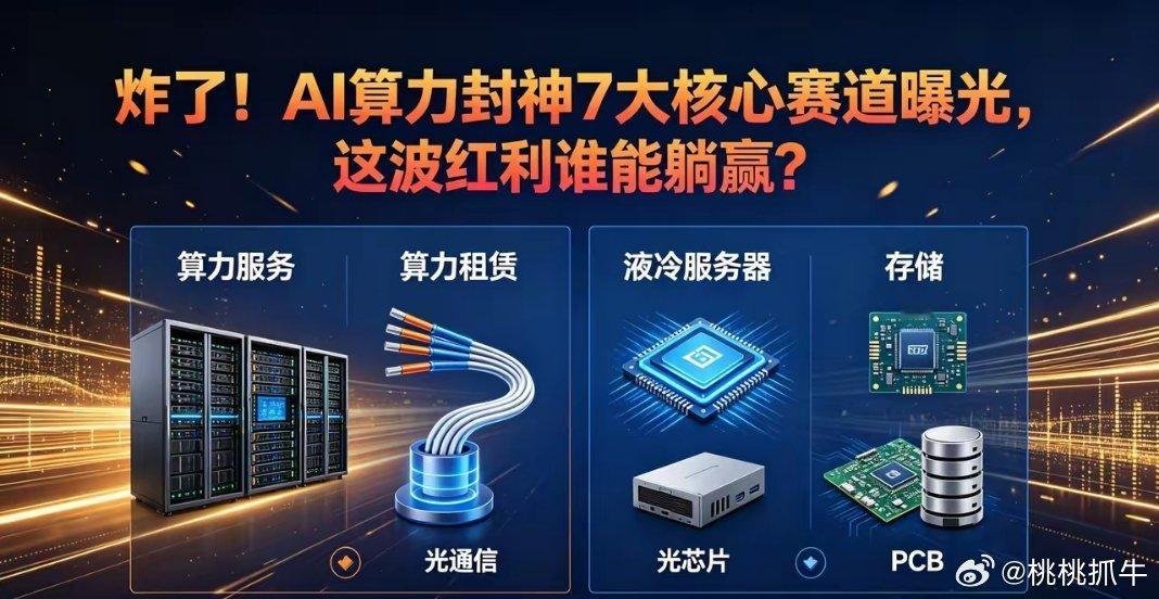 炸了!AI算力封神7大核心赛道曝光,这波红利谁能躺赢?家人们!AI浪潮彻底掀翻天花板,算力租赁核心赛道集体“炸场”,七大方向全是资金抢筹的真风口,错过真得拍断大腿!算力服务成“香饽饽”,按需求灵活调用,像用水用电一样方便,2026年市场规模狂飙2600亿,业绩直接兑现!算力租赁更离谱,龙头订单锁到2028年,高毛利40%+,产能利用率90%+,稳稳赚翻天!光通信+光芯片双轮驱动,800G高速光模块需求爆火,CPO技术直接引爆行业,算力传输效率拉满!液冷服务器是“节能王”,浸没式液冷、冷板式液冷齐发力,PUE降到1.2以下,政策疯狂扶持!存储扛住数据“大管家”,PCB筑牢算力“地基”,七大方向全踩中AI核心命脉,资金进场痕迹藏都藏不住!别再犹豫,这波算力大行情是真风口!想知道七大赛道核心龙头、入场时机?评论区扣“算力封神”,立刻给你拆解!财经观察官
