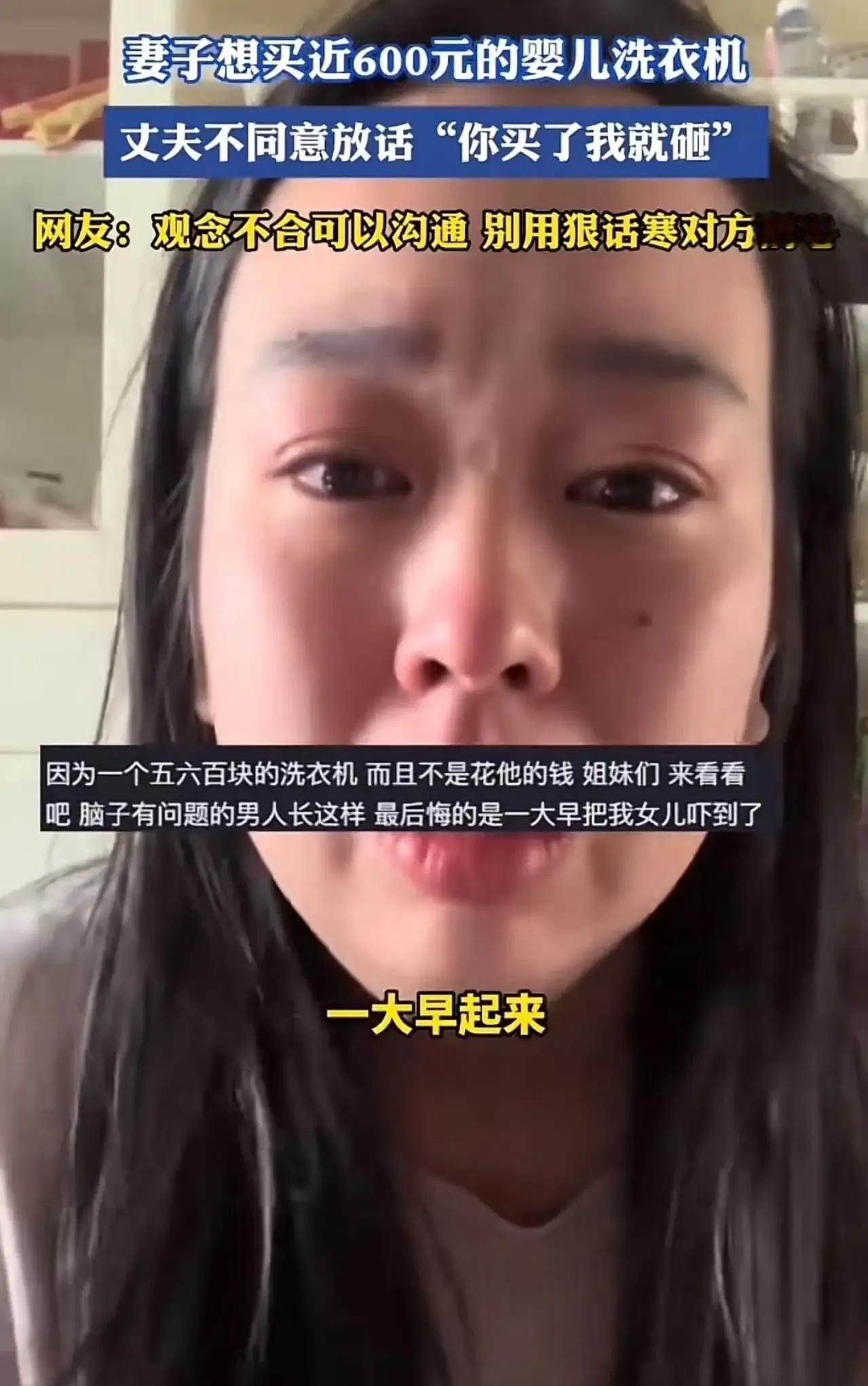 女子花五六百买婴儿洗衣机,竟被丈夫怒砸!丈夫还放狠话:“你买了我就会砸!”这究竟是怎么回事?网友们为此吵翻了天。 原来,这名女子心疼孩子,觉得手洗婴儿衣物既费时又费力,于是花五六百买了台婴儿洗衣机。可没想到,丈夫得知后竟然大发雷霆,直接将洗衣机砸毁。有网友站队丈夫,认为婴儿洗衣机根本没必要,女子就是被商家洗脑了,丈夫是实在讲不通才急眼的,跟价格无关。但也有网友看得透彻,他们指出丈夫反对的真正原因:娃的衣服不用他洗,娃生病了不用他熬夜照顾,娃哭闹也不用他哄,说不定背后还有个嫌儿媳妇乱花钱的婆婆在撺掇。这番话真是说到了点子上,家务事本就是夫妻共同的责任,不能因为性别就有所偏颇。而且,买婴儿洗衣机也是为了孩子好,丈夫如此粗暴地反对,实在让人难以理解。 这事儿真是公说公有理,婆说婆有理。但无论如何,夫妻之间都应该多沟通、多理解。大家对于这件事有什么看法呢?快来评论区留言讨论吧!情感分享与沟通 夫妻该怎样沟通